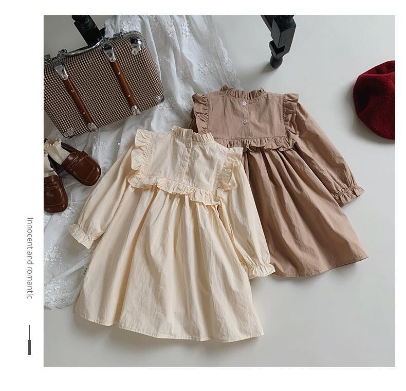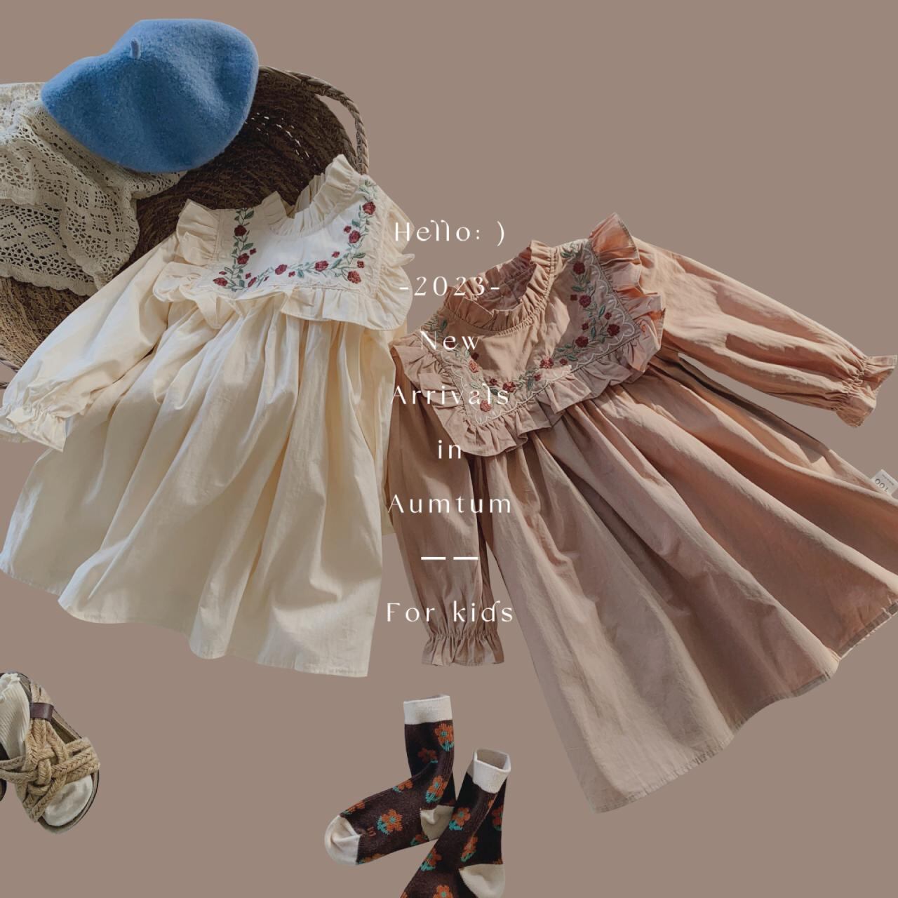 ワンピース 女児 長袖 春秋 子供 Aライン チュールスカート 杏色 カーキ 花柄 刺繍 襟付き かわいい おしゃれ 普段着 お出かけ 90cm 100cm 110cm 120cm 130cm 140cm