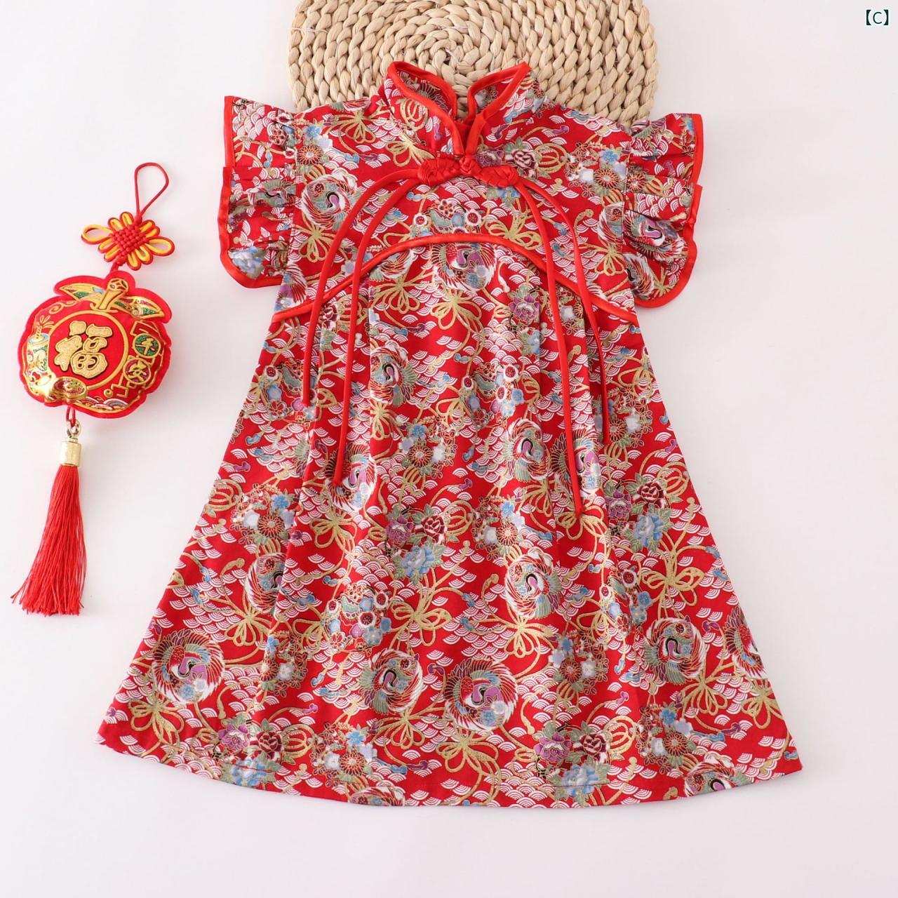 ワンピース 子供 女の子 中国風 チュール Aライン 膝丈 ノースリーブ 花柄 春夏 発表会 演奏会 普段着 お出かけ イベント 赤 ピンク系