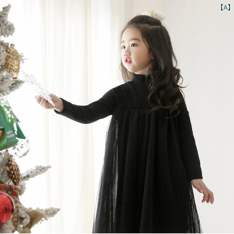 ワンピース キッズ 子供服 長袖 チュールスカート プリンセス 春秋 冬 裏起毛 コットン チュール ブラック 発表会 結婚式 パーティー フォーマル かわいい