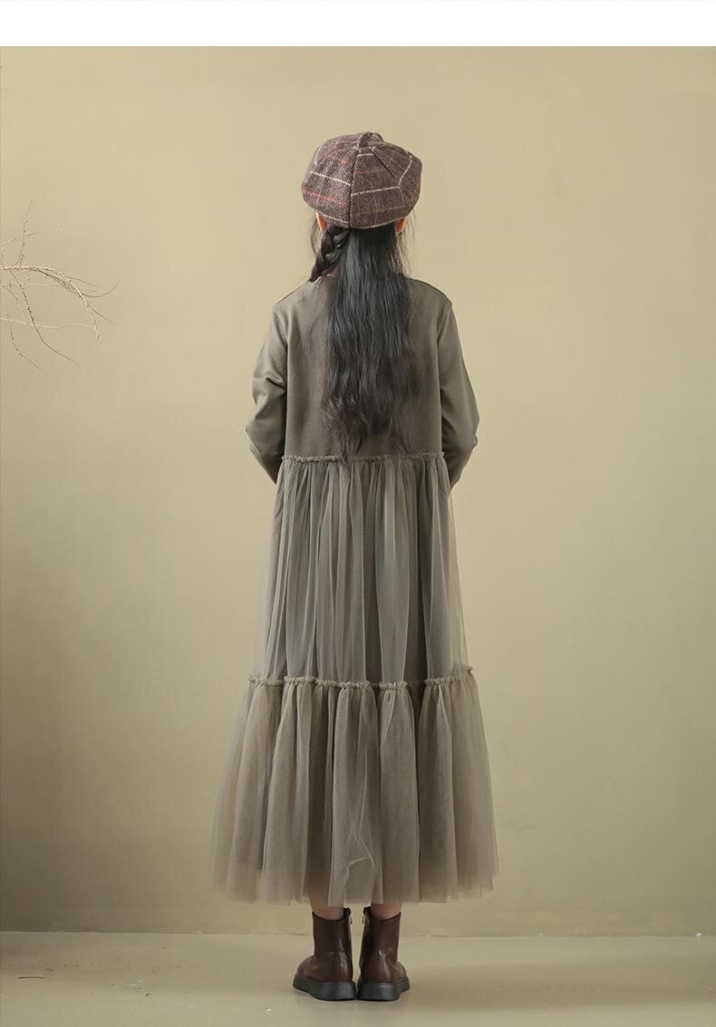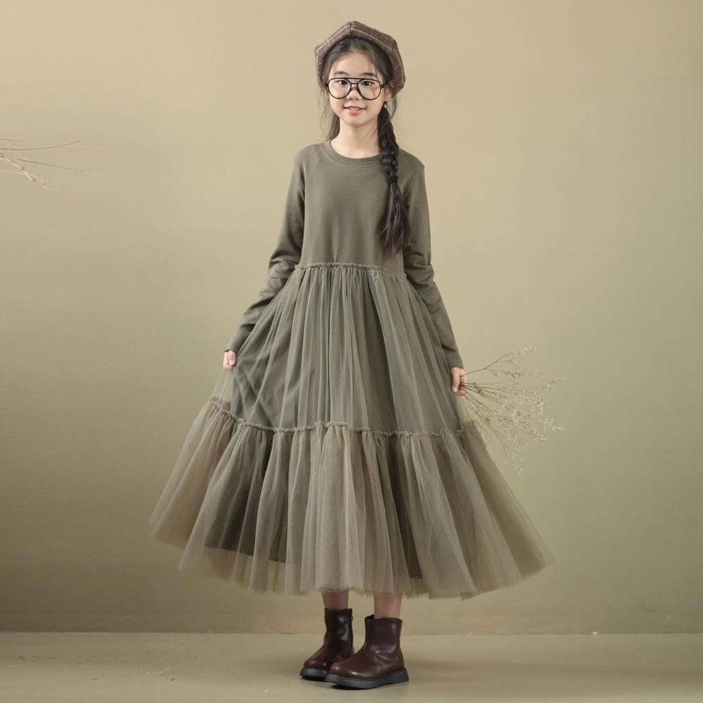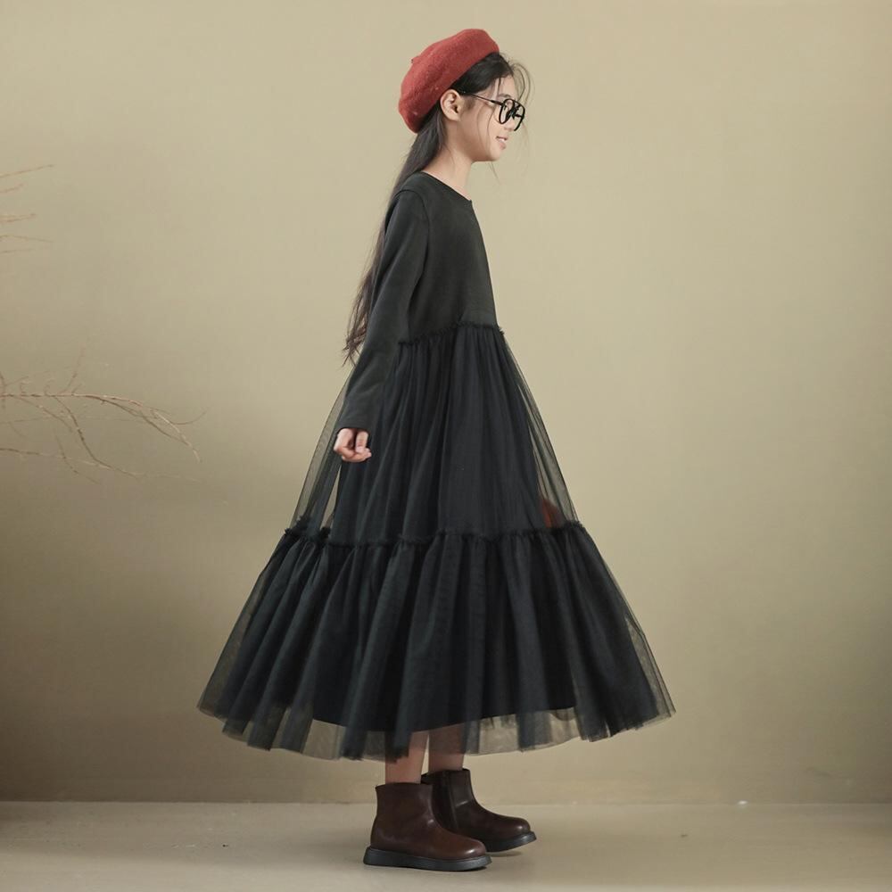 ワンピース 女の子 子供服 長袖 チュール 切り替え 膝丈 ミモレ丈 Aライン フレアスカート 春秋 秋冬 かわいい 森ガール 親子コーデ 発表会 結婚式 ブラック 黒 グリーン 緑 140 150 160 170