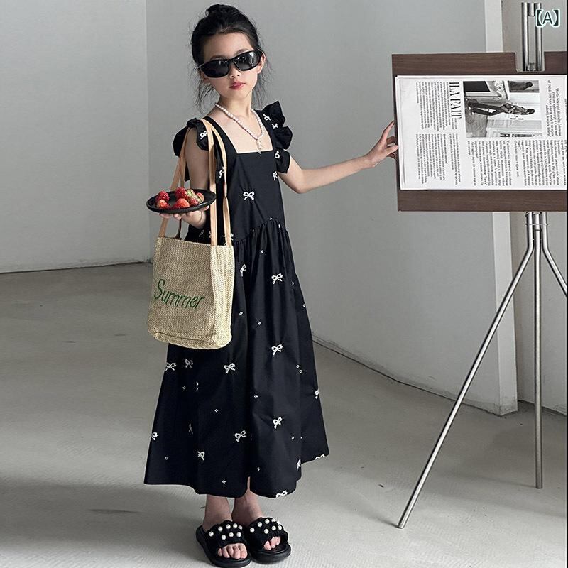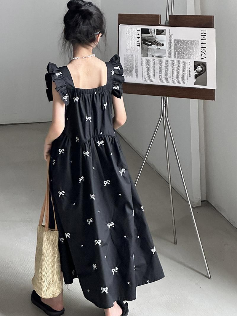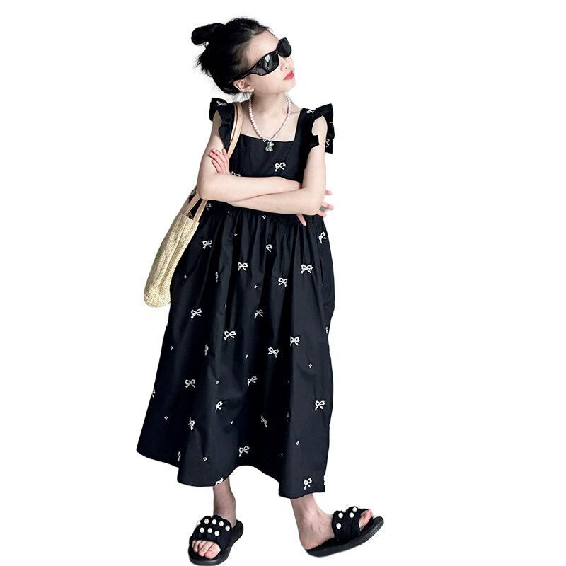 ワンピース キッズ 女の子 サマー ビーチワンピース 子供 ロングワンピース ノースリーブ 薄手 コットン混紡 黒 刺繍 プリンセスライン カジュアル 膝丈 120cm 130cm 140cm 150cm 160cm