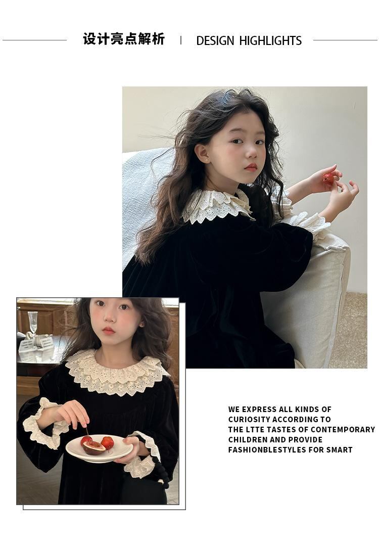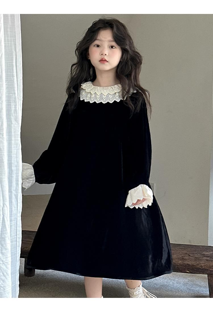 ワンピース キッズ 女の子 長袖 Aライン ベルベット 襟付き フォーマル かわいい おしゃれ ブラック 発表会 結婚式 パーティー 120 130 140 150 160 170
