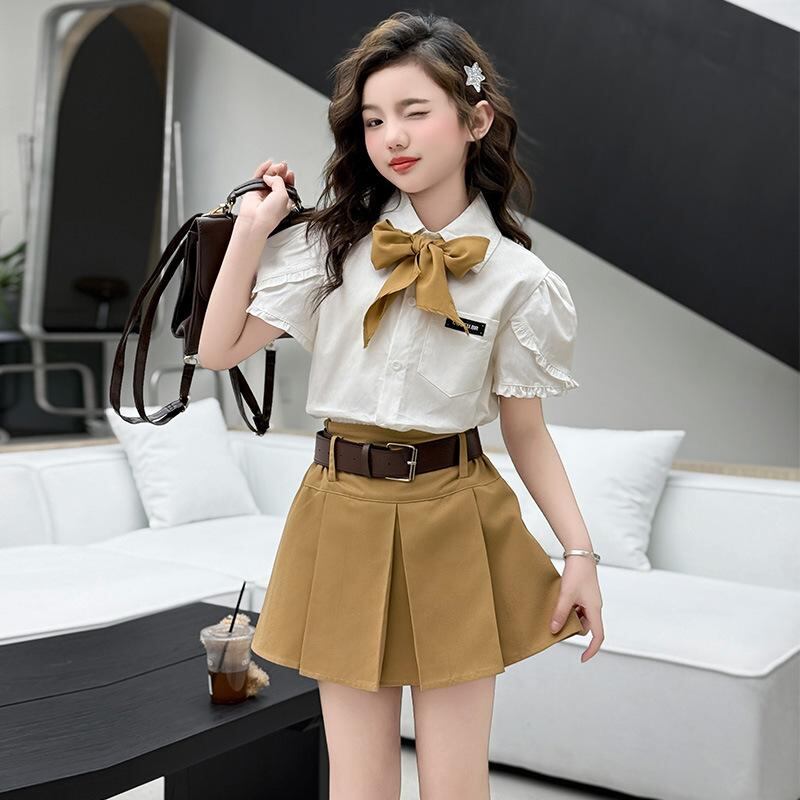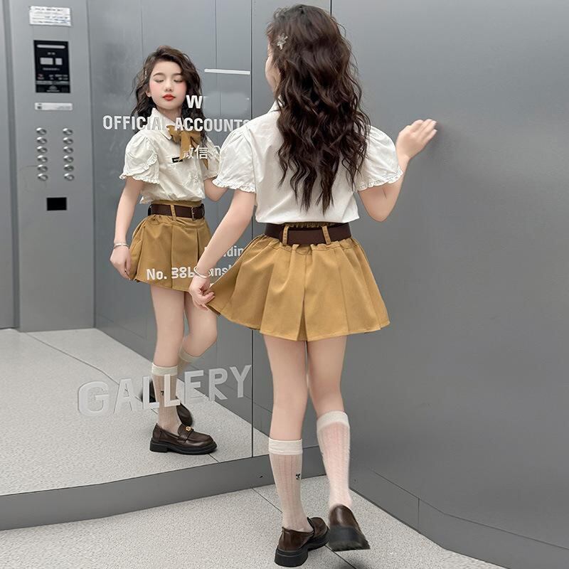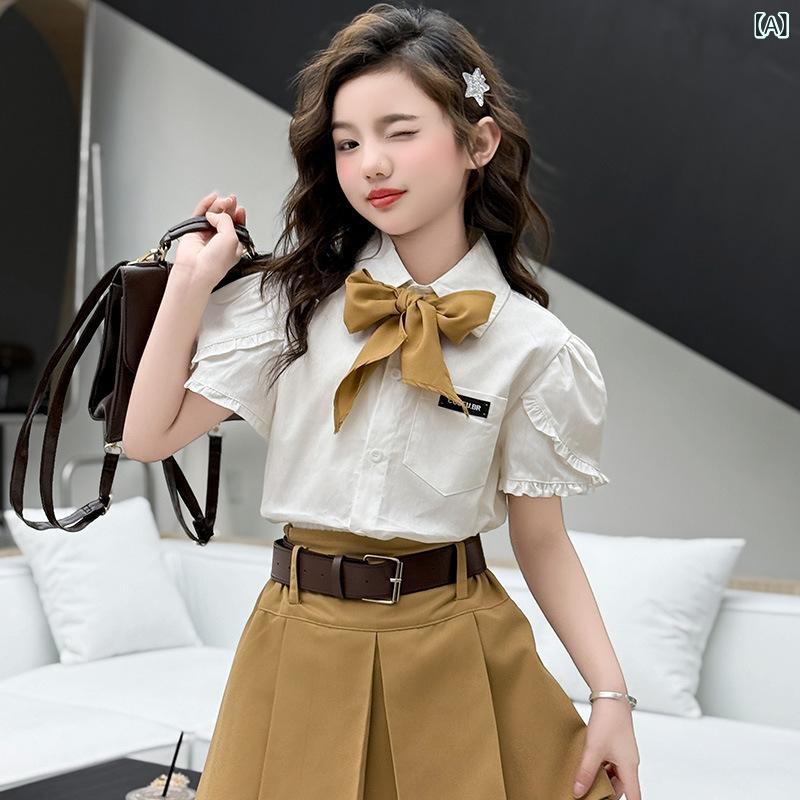 シャツ 女の子用 半袖 ブラウス プリーツスカート セットアップ 子供服 キッズ 夏服 薄手 通学 発表会 演奏会 フォーマル 格子柄 ポリエステル