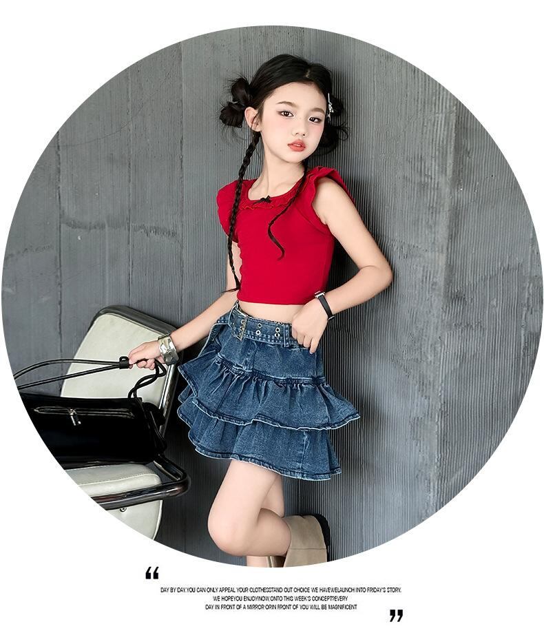 子供用 セットアップ 女の子 夏 韓国風 中高学年 ノースリーブ トップス デニムスカート 2点セット かわいい 薄手
