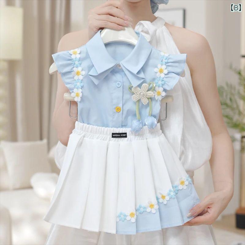 キッズ セットアップ 子供服 女の子 夏 半袖 シャツ プリーツスカート 上下 2点 花柄 薄手 かわいい おしゃれ 韓国風 イエロー ブルー 100 110 120 130 140 150 160 170
