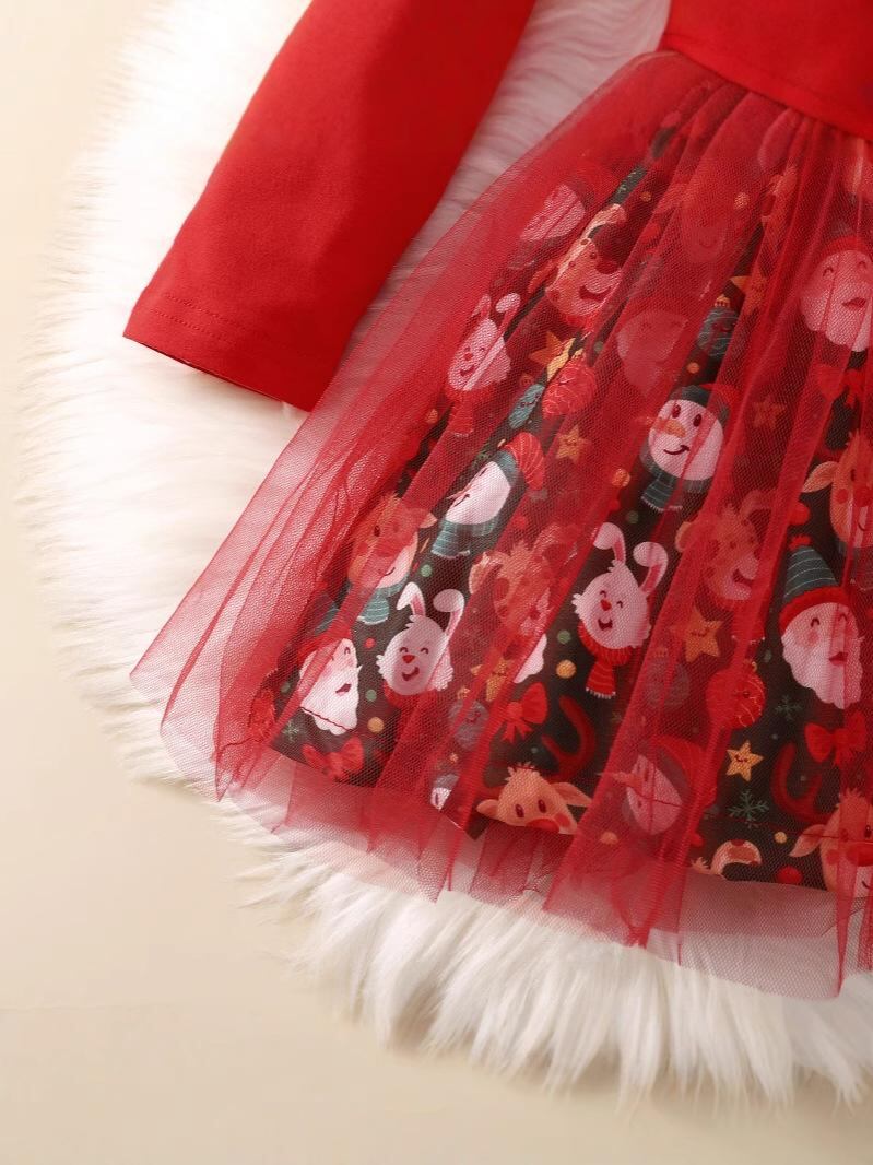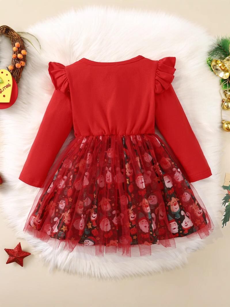 ワンピース 女の子 クリスマス 雪 長袖 アルファベット チュール ふんわり Aライン プリンセス 春秋冬 80 90 100 110 120 赤 緑