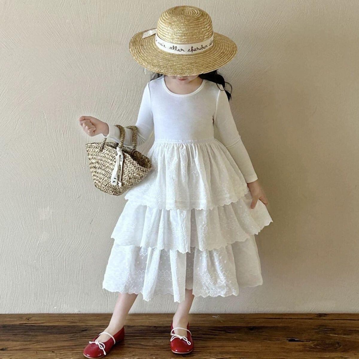 ワンピース キッズ 女の子 ニット レース ケーキスカート バレエ プリンセス 春秋 長袖 チュールスカート 白 90 100 110 120 130 140