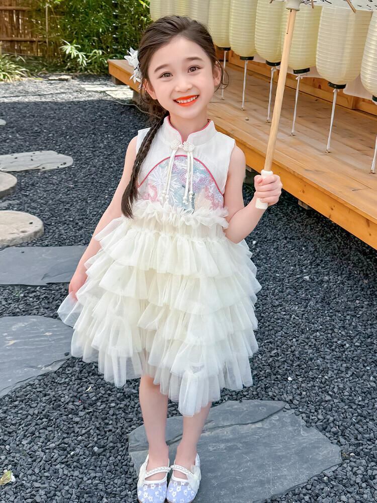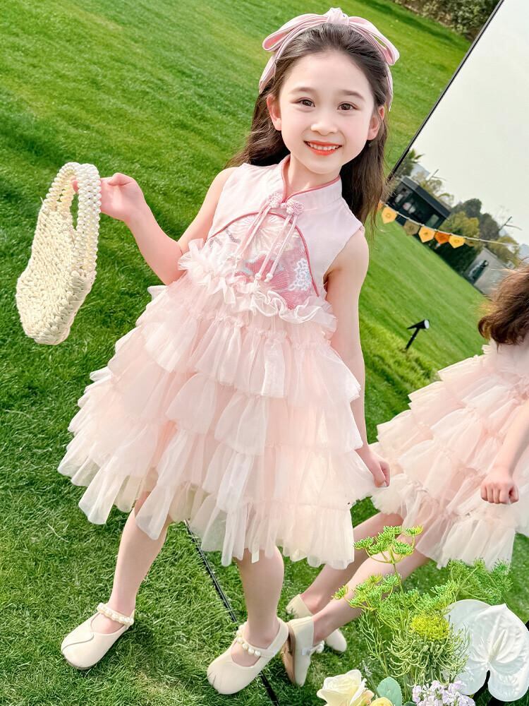 ワンピース キッズ 女の子 子供 新中式 チャイナドレス 花柄 ノースリーブ ケーキスカート ポリエステル混紡 ピンク系 春夏 かわいい プリンセス イベント パーティー