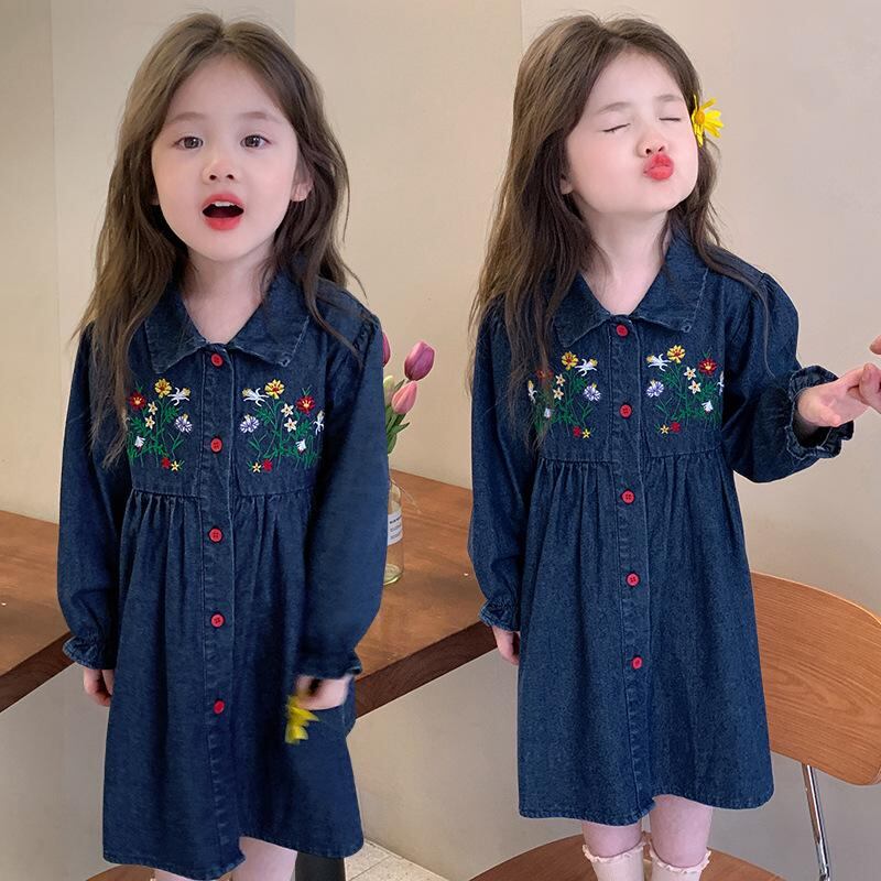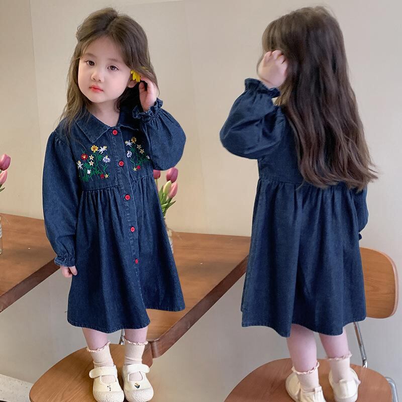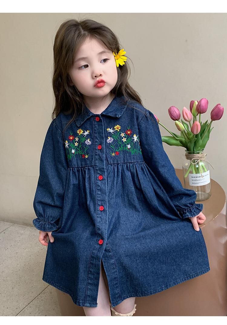 ワンピース 女の子 子供服 デニム 花柄 刺繍 長袖 チュニック Aライン かわいい おしゃれ 春秋