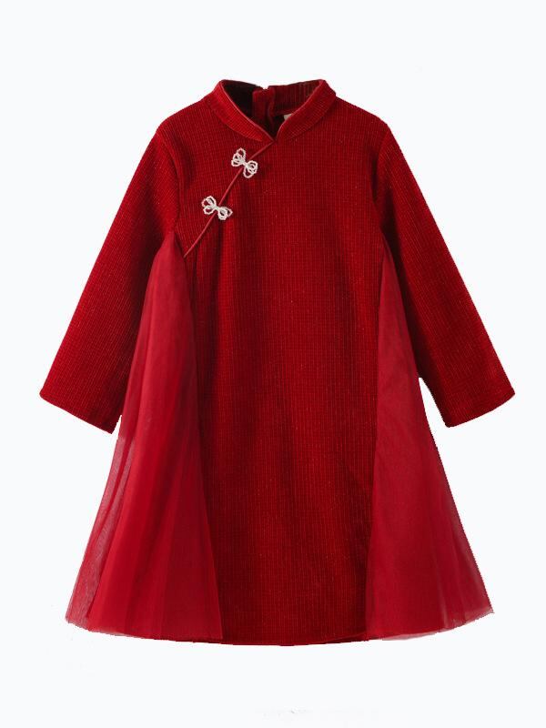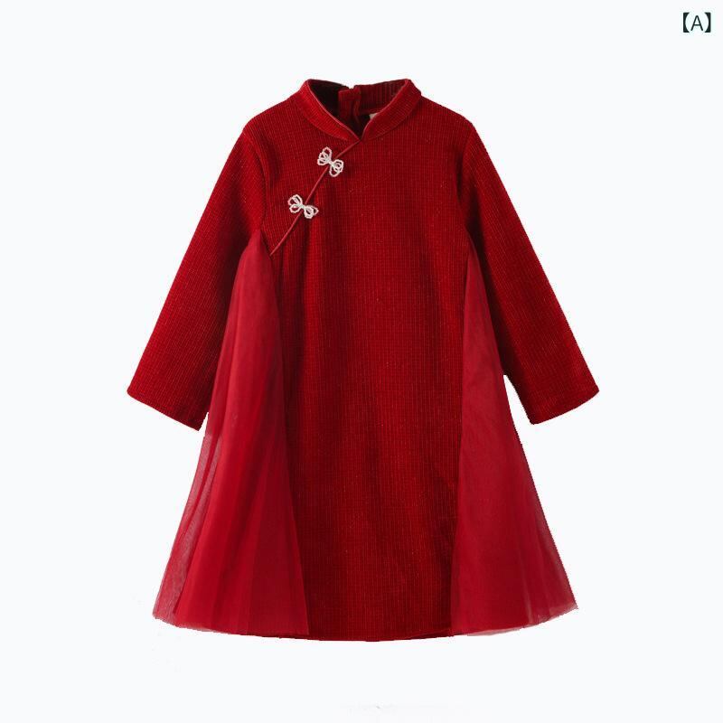 ワンピース 女の子 中国風 唐装 新年 クリスマス ハロウィン 長袖 膝丈 チュール 発表会 演奏会 結婚式 パーティー お正月 厚手 暖かい 120 130 140 150 160 170 赤色 聚酯纤维