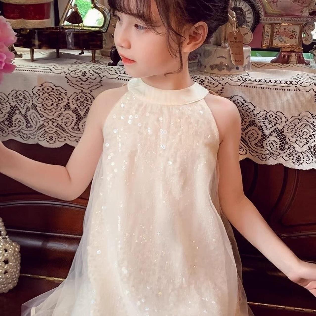 ワンピース キッズ 女の子 子供 ノースリーブ レース プリンセスドレス Aライン フレアスカート かわいい おしゃれ お出かけ 発表会 結婚式 パーティー 白
