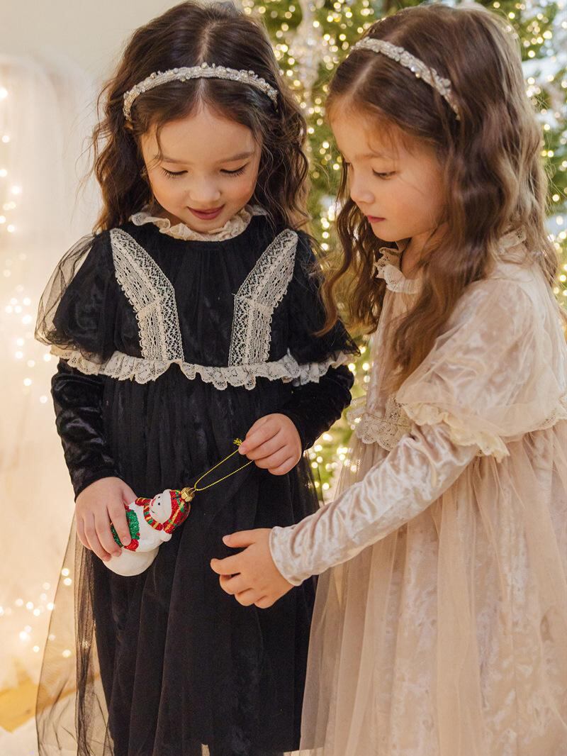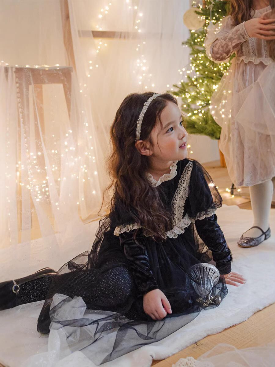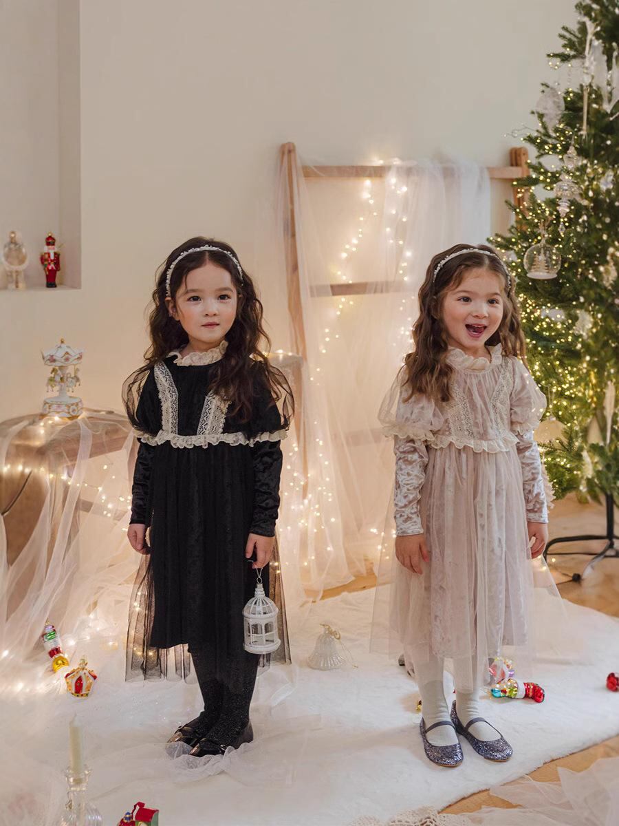 ワンピース キッズ 女の子 レース チュール 花柄 長袖 プリンセスドレス 子供 秋冬 発表会 結婚式 誕生日 バースデー クリスマス 金色 ベルベット 90 100 110 120 130 140 150