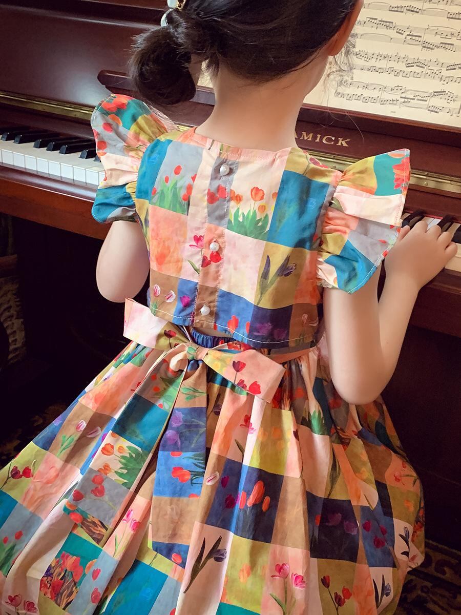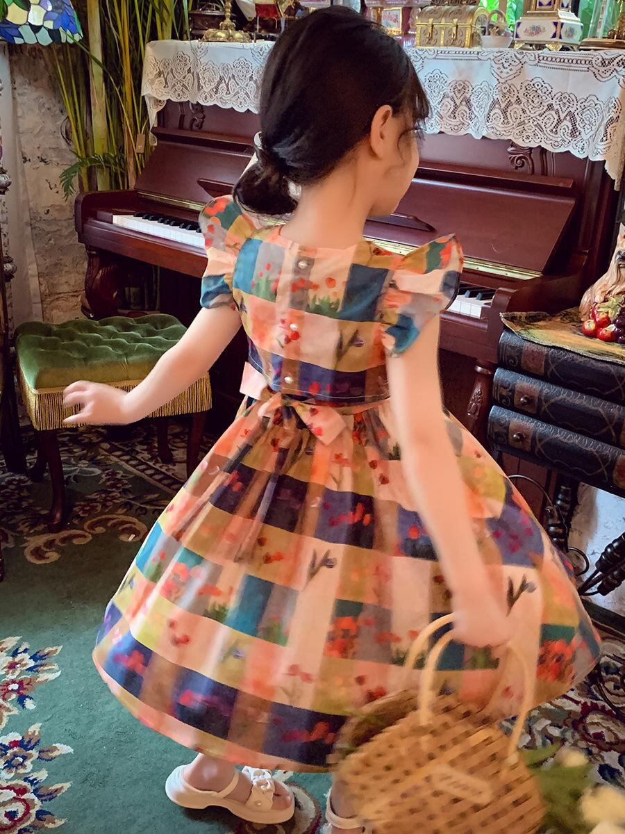 ワンピース キッズ 女の子 子供服 夏 ノースリーブ チュニック 膝丈 庭園風 チェック柄 小花柄 かわいい 綿混紡 韓国風 プリンセスライン 90cm 100cm 110cm 120cm 130cm