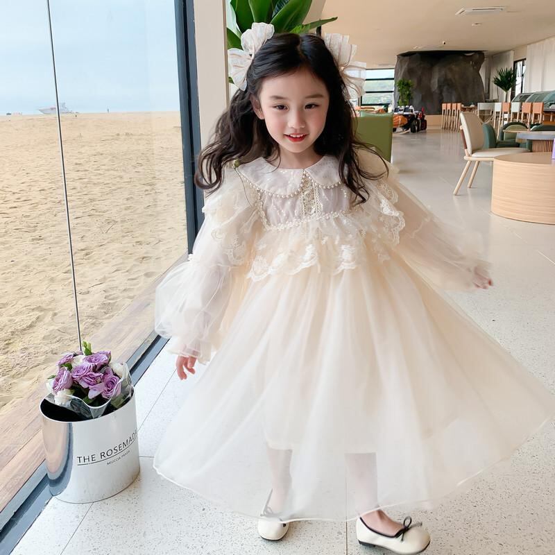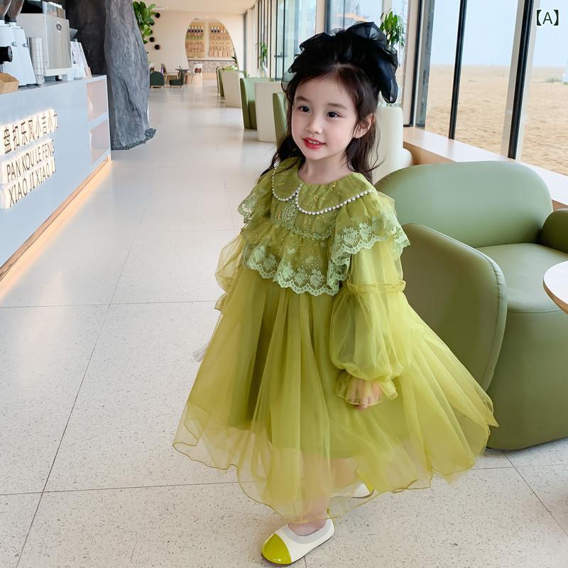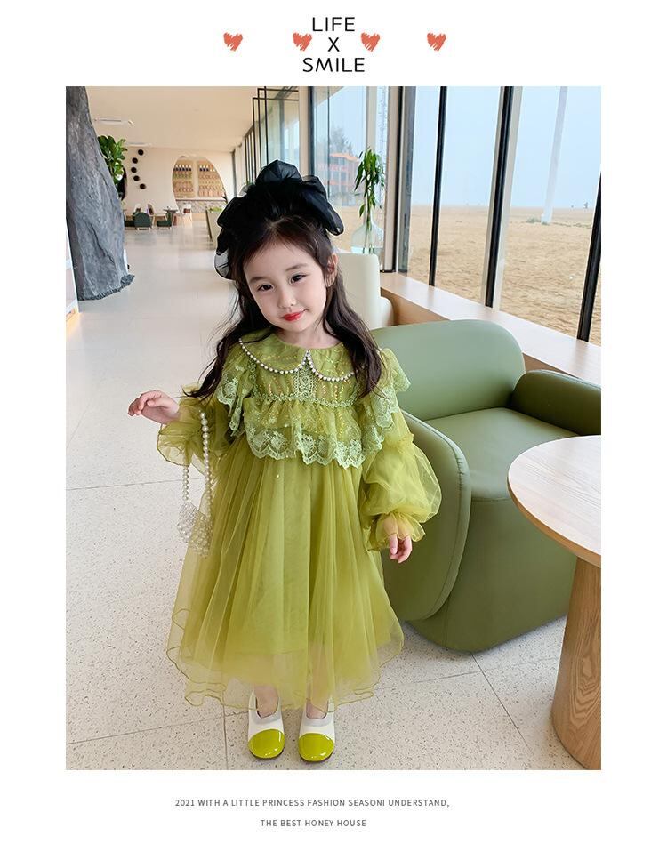 ワンピース 子供 女の子 レース 長袖 プリンセス チュールスカート チュール パーティードレス フォーマル 結婚式 発表会 春秋 90 100 110 120 130 140 150 グリーン シャンパン