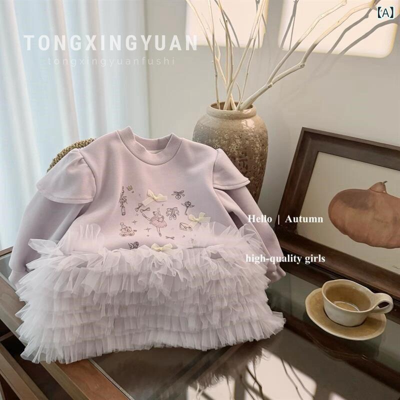 ワンピース キッズ 秋冬 レース 花柄 長袖 チュールスカート ベルベット 裏起毛 パープル かわいい 暖かい 子供 女の子 80 90 100 110 120 130