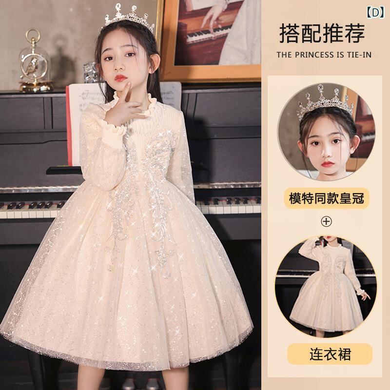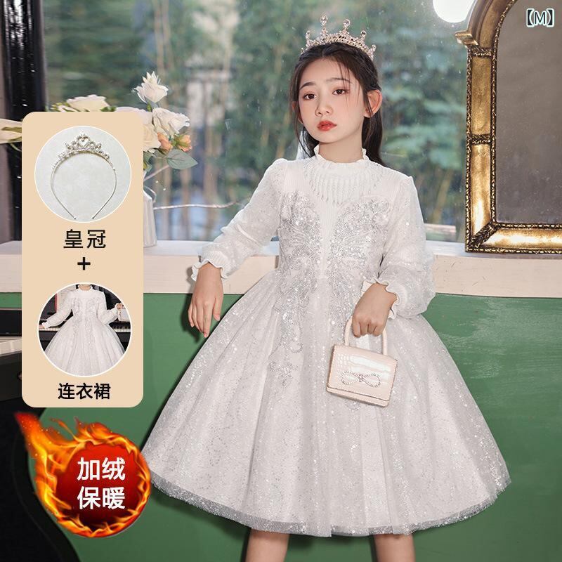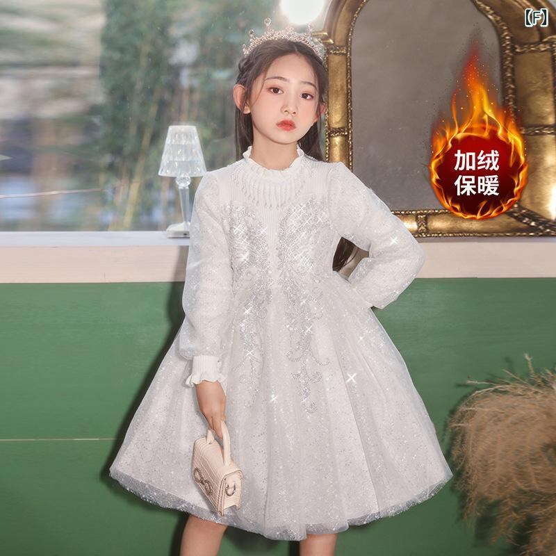 ワンピース キッズ 女の子 フォーマル ドレス 子供 礼服 プリンセス Aライン 結婚式 発表会 誕生日会 長袖 チュール レース フリル ギャザー 厚手 ウール混紡 秋冬 かわいい シャンパン色 白 110cm 120cm 130cm 140cm 15