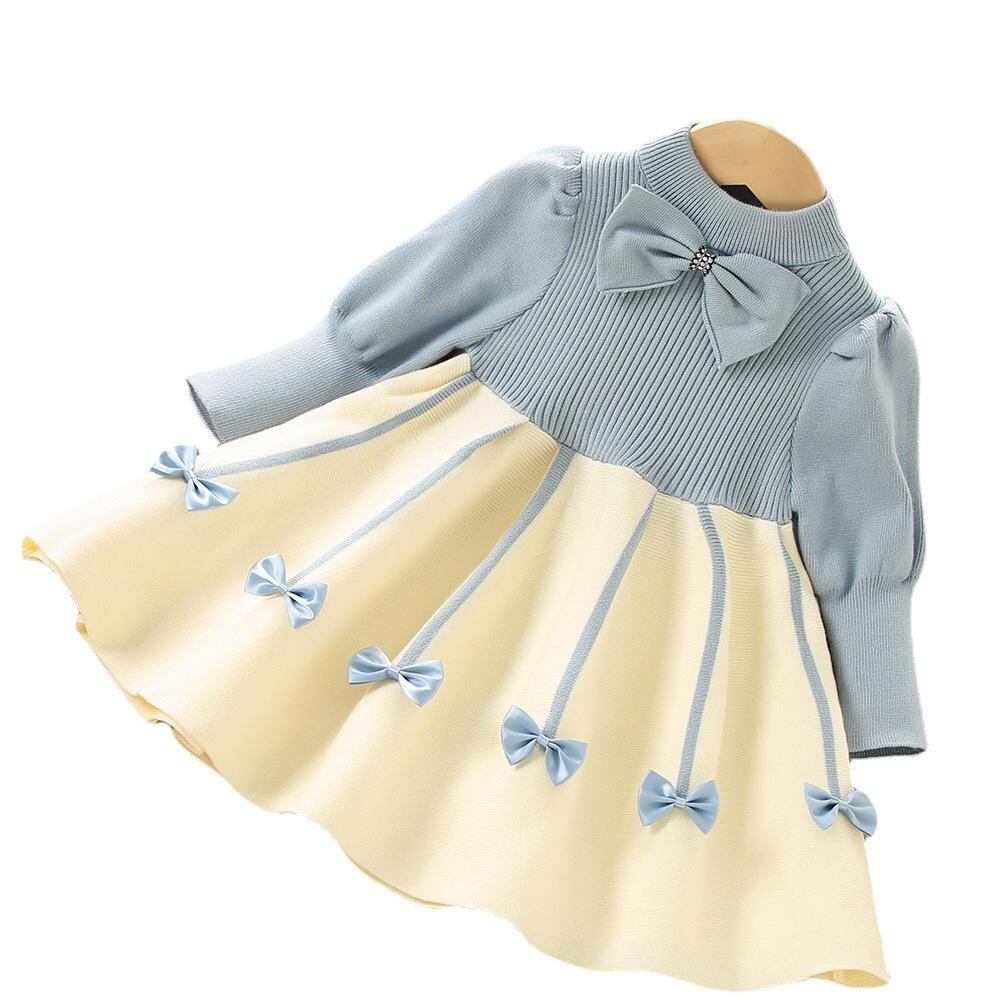 ワンピース 女の子 ニットワンピース 長袖 膝丈 プリンセスライン 子供 秋冬 かわいい 蝶結び 泡袖 おしゃれ ガーリー 赤 ピンク系 青 90 100 110 120 130