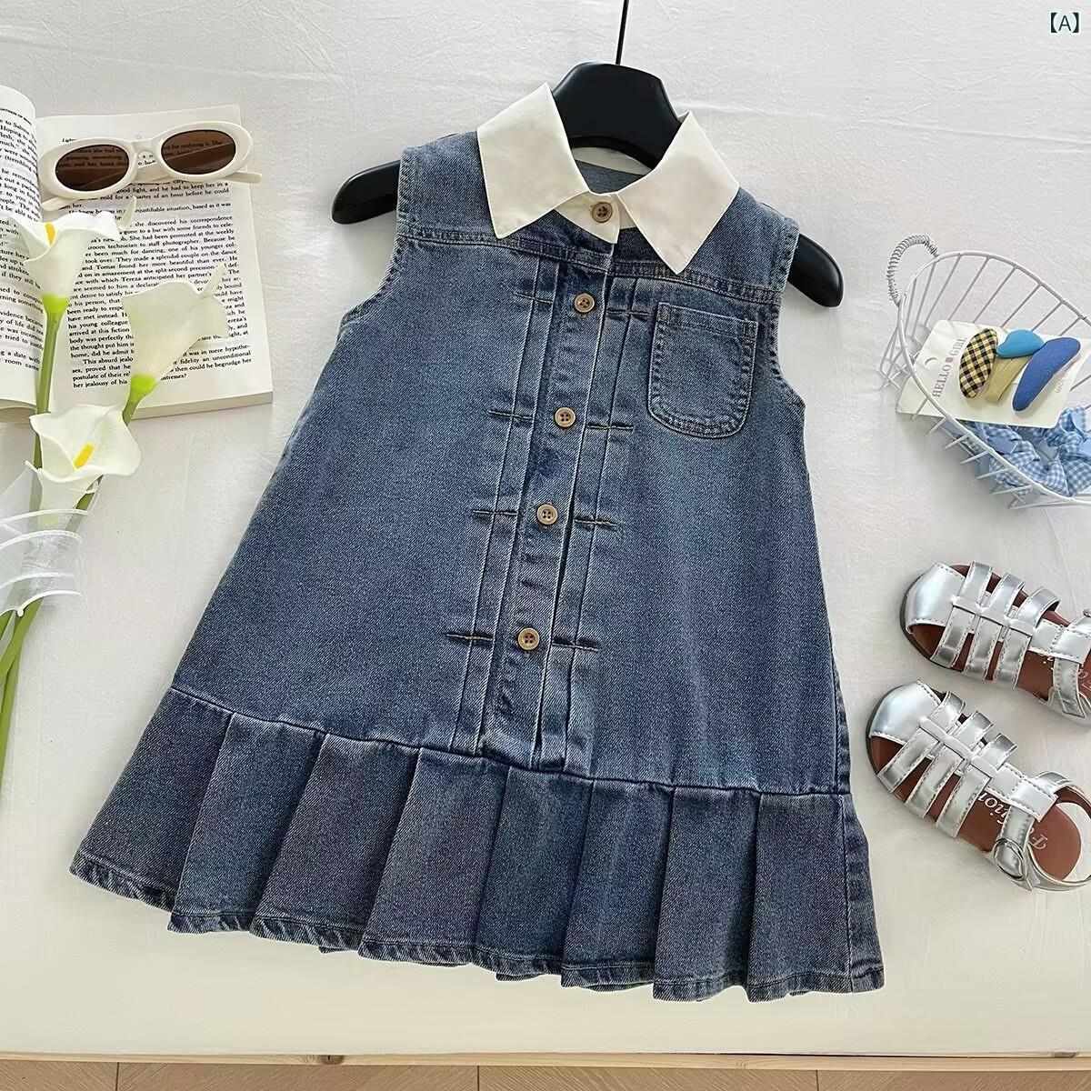 ワンピース 女の子 デニム 春夏 子供服 ノースリーブ チュニック Aライン 膝丈 無地 かわいい ガールズ キッズ おしゃれ カジュアル