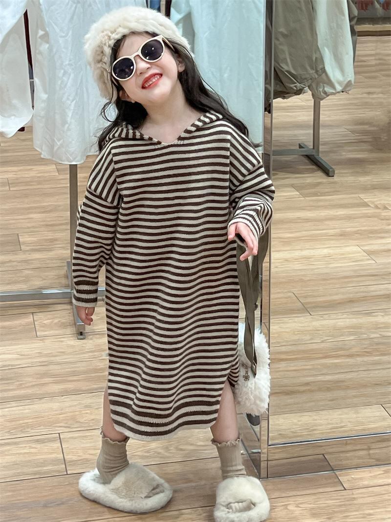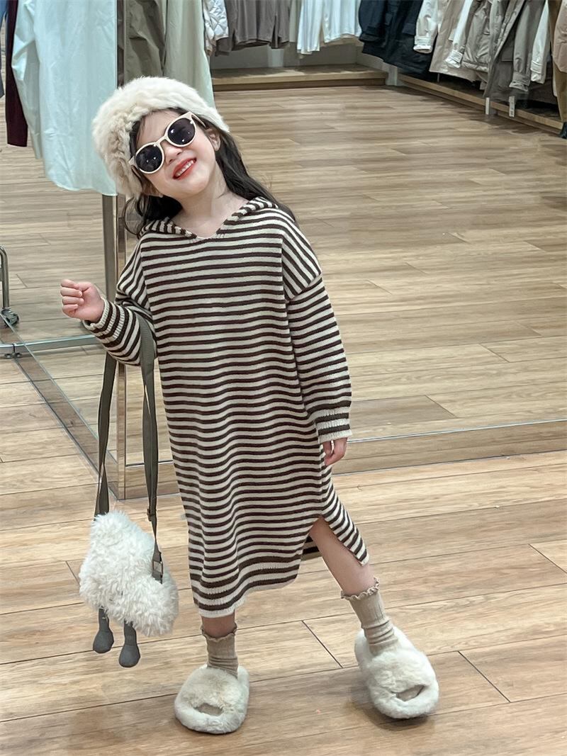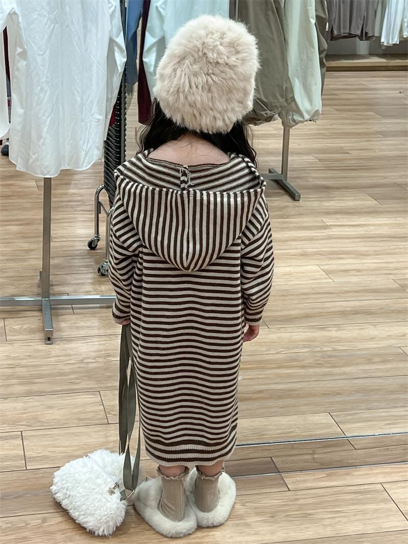 子供服 女の子 ストライプ柄 パーカーワンピース プリンセスドレス ニットワンピース 長袖 Aライン コットン 秋冬