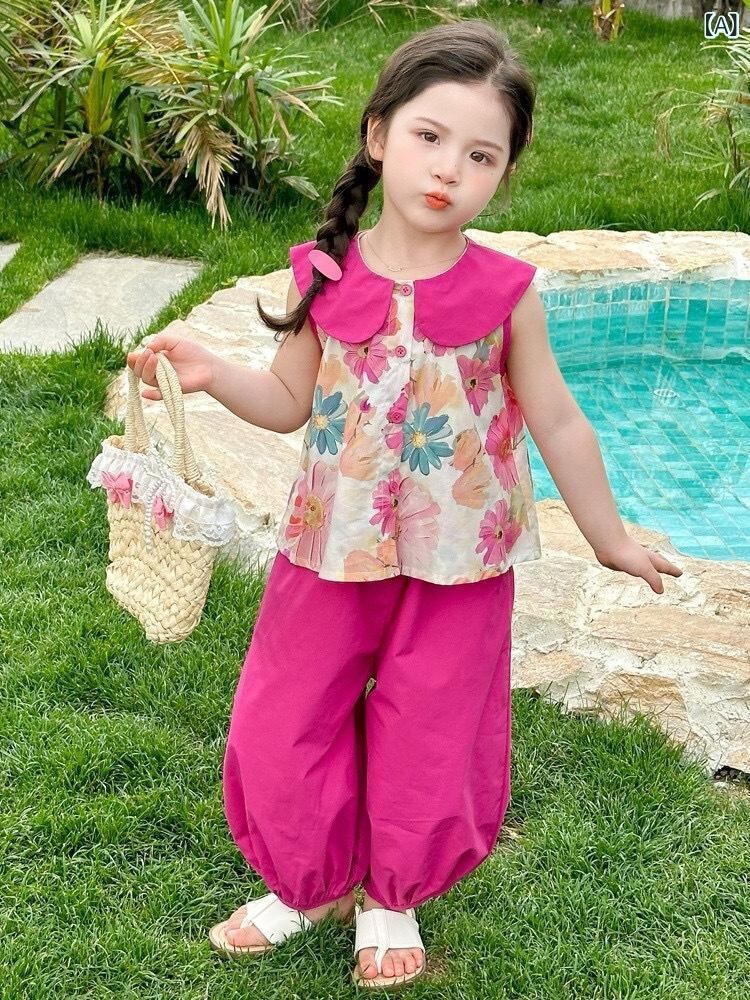 子供服 女の子用 2点セット ワンピース チュニック 薄手 夏服 かわいい 花柄 襟付き ストライプ ノースリーブ 80 90 100 110 120 130 140 150 160 ピンク系 黄色