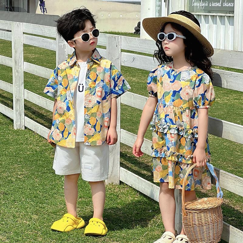 キッズ 花柄シャツ 半袖 セットアップ 子供服 ワンピース 春夏 薄手 男女兼用 男の子 女の子 兄弟 姉妹 ペアルック 綿100% かわいい