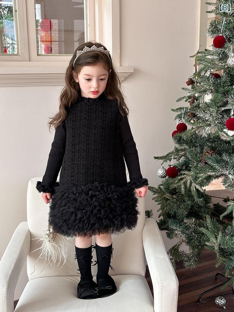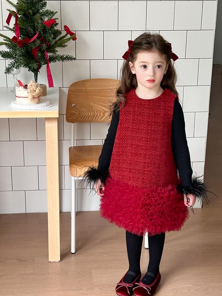 ワンピース 女の子 子供 プリンセスドレス チュールスカート ベストワンピース 裏起毛 膝丈 フォーマル 発表会 結婚式 パーティー 赤 黒