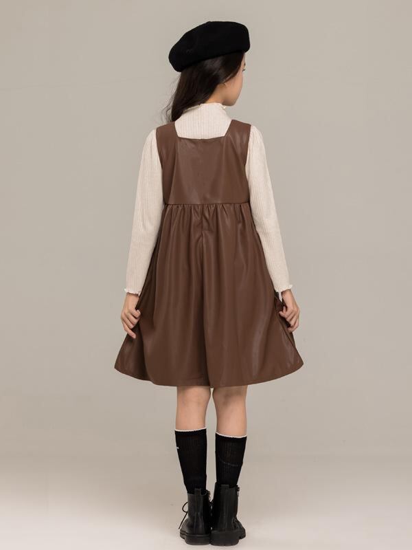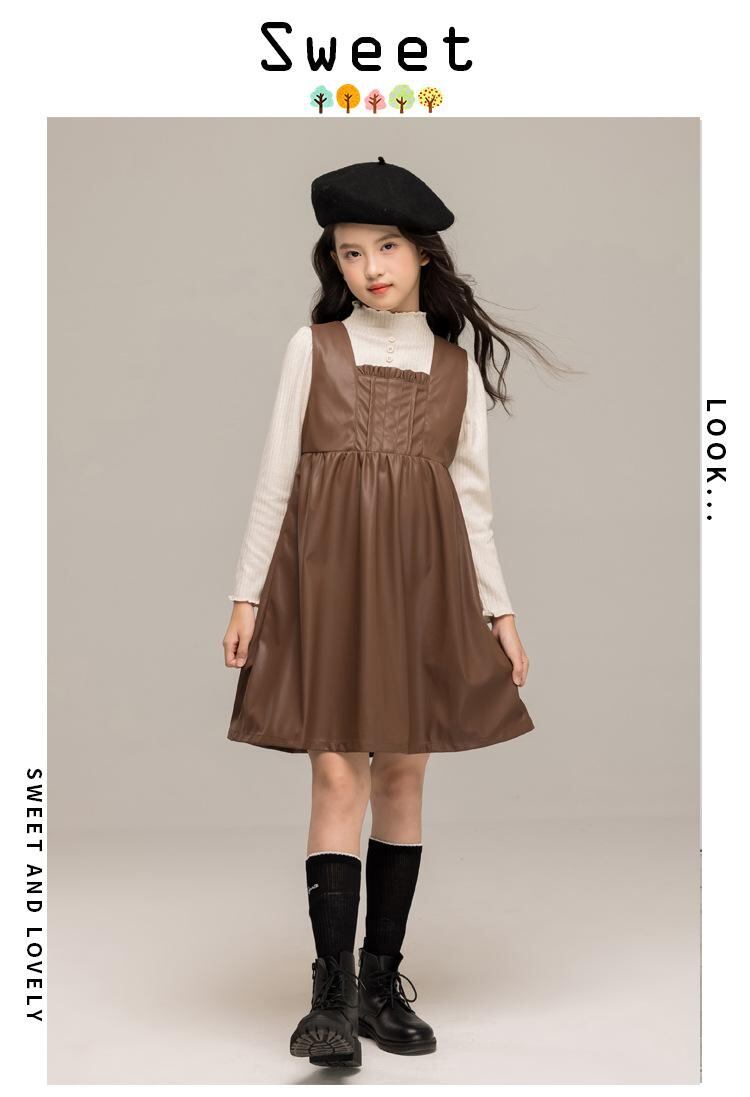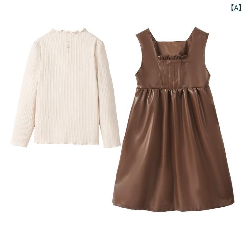 ワンピース ガールズ 子供服 長袖トップス ベストスカート 2点セット フォーマル 発表会 演奏会 結婚式 PUレザー 伸縮性 Aライン 春秋