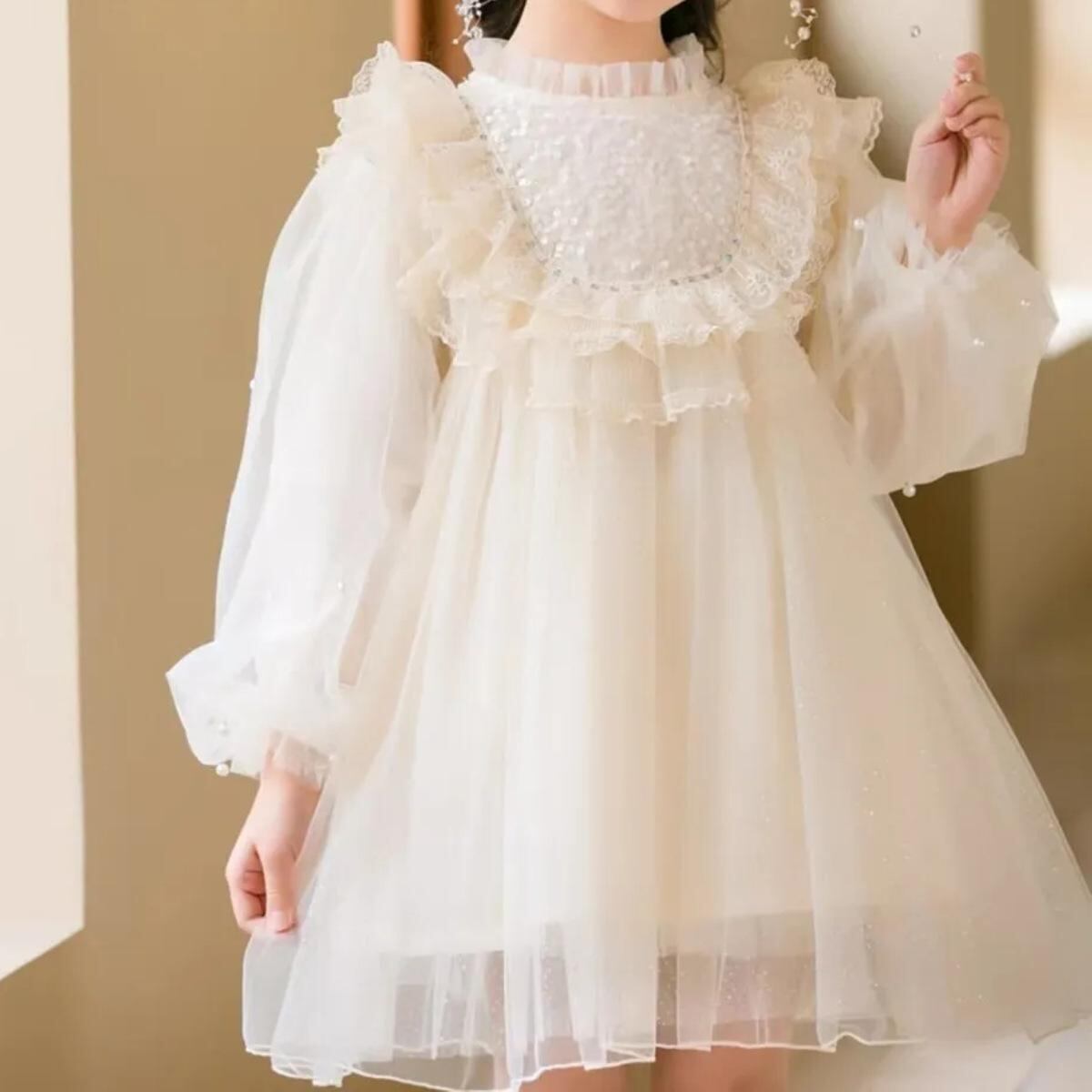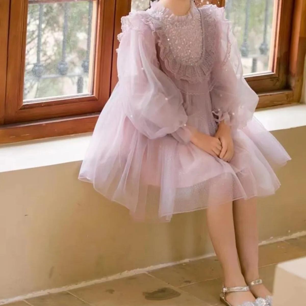 ワンピース 女の子 子供 プリンセス 春秋 星空 スパンコール チュール 100 110 120 130 140 150 160 パープル ベージュ かわいい おしゃれ