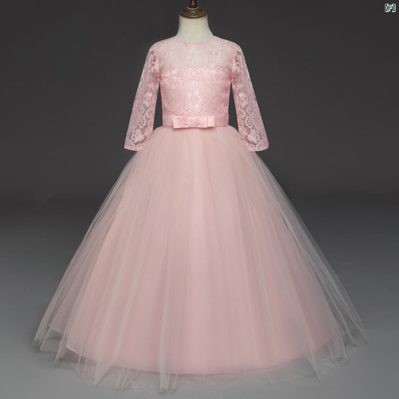子供用ドレス 長袖ワンピース 結婚式 花童 プリンセスドレス チュールスカート 発表会 演奏会 フォーマル 膝丈 Aライン ポリエステル 柔らかい ニット生地 伸縮性 通年 ブルー ピンク パープル レッド ホワイト 110cm 120cm 130cm