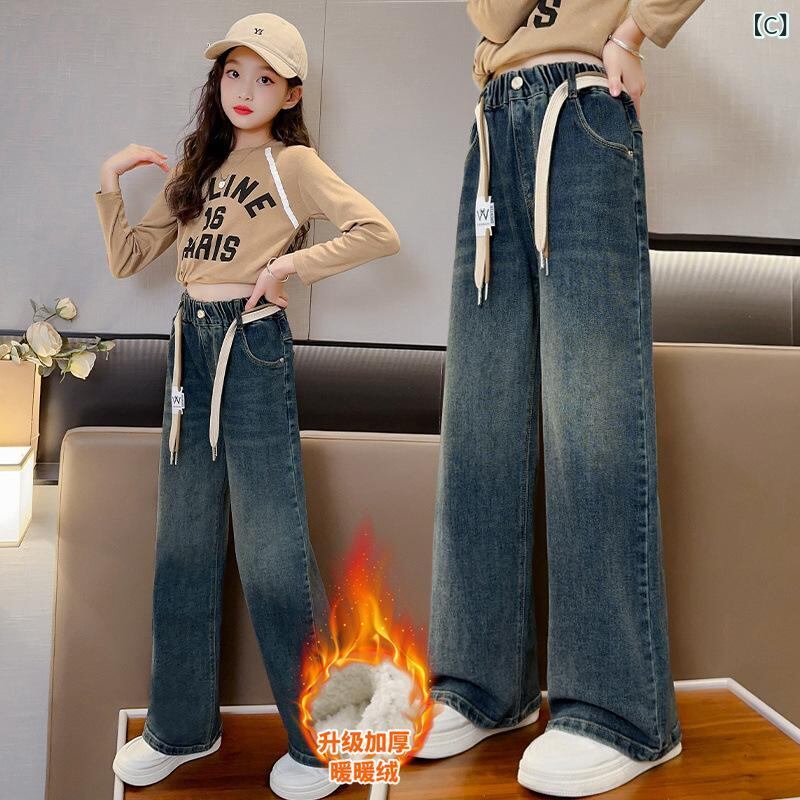 子供服 ジーンズ 女の子 ワイドレッグパンツ 秋冬 裏起毛 ルーズ ストレート ジーパン デニムパンツ ガールズ 女児 厚手 普段着 通学着 かわいい 高学年 中学生