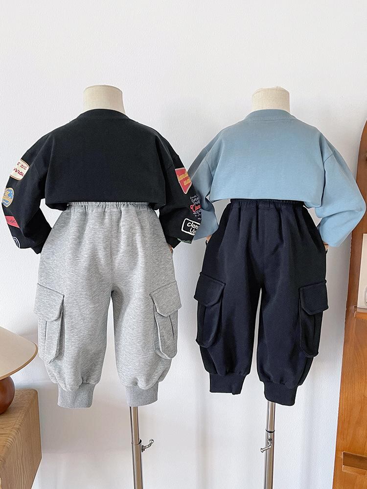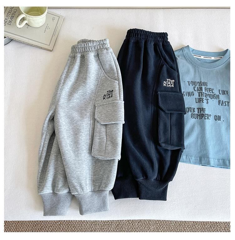 子供用パンツ キッズ 刺繡 レタープリント カジュアルパンツ ボーイズ ロングパンツ ウエストゴム 裾絞り 綿混紡 普段使い 春秋 グレー ブラック