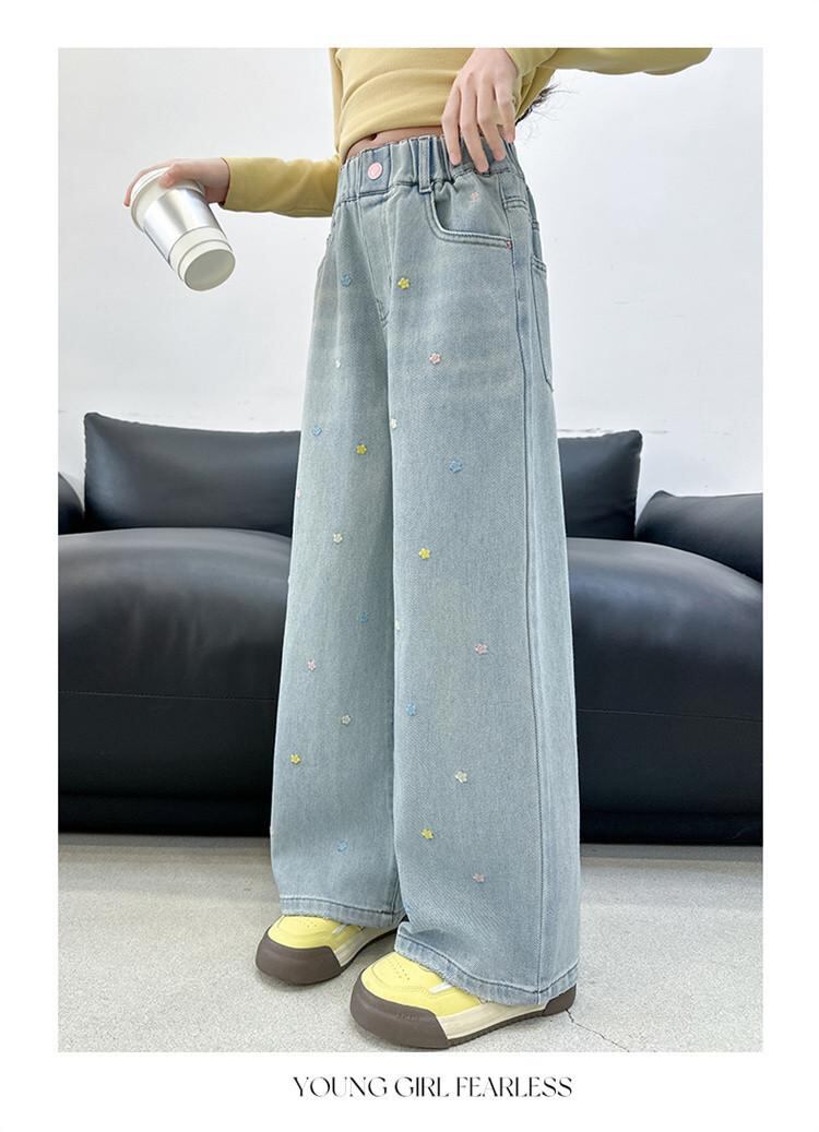 子供服 デニムパンツ ガールズ 春物 カジュアルパンツ ワイドレッグパンツ 綿 花柄 刺繍 普段使い 8歳以上