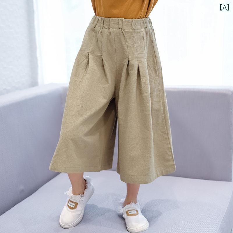 子供服 ワイドパンツ ガールズ 女の子 夏用 リネンパンツ ゆったり 7分丈 キュロット 薄手 涼しい 快適 通気性 グリーン ブラック
