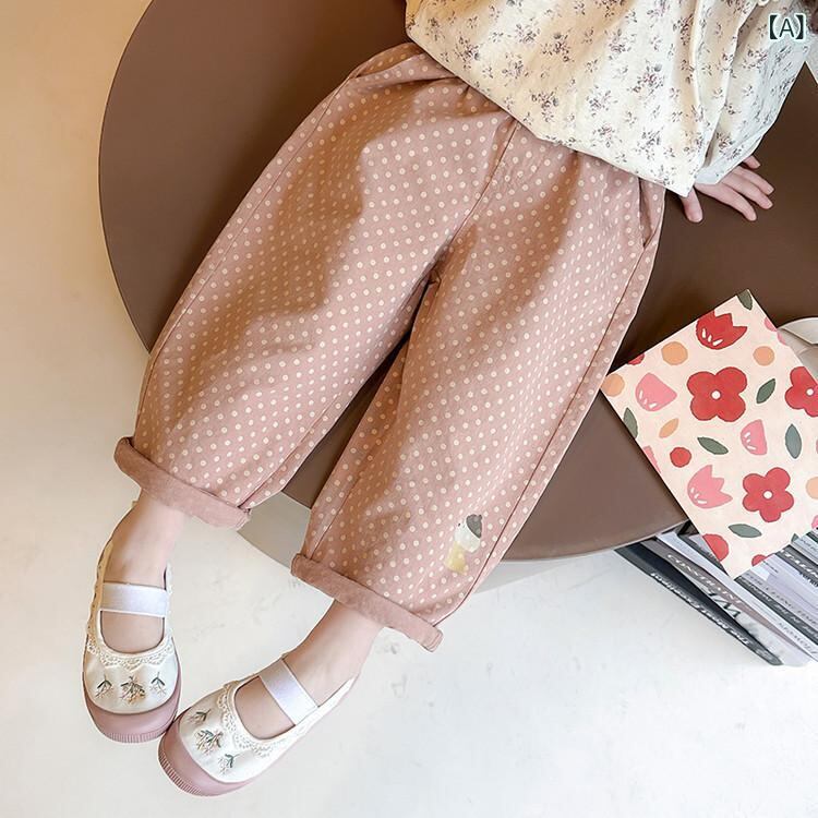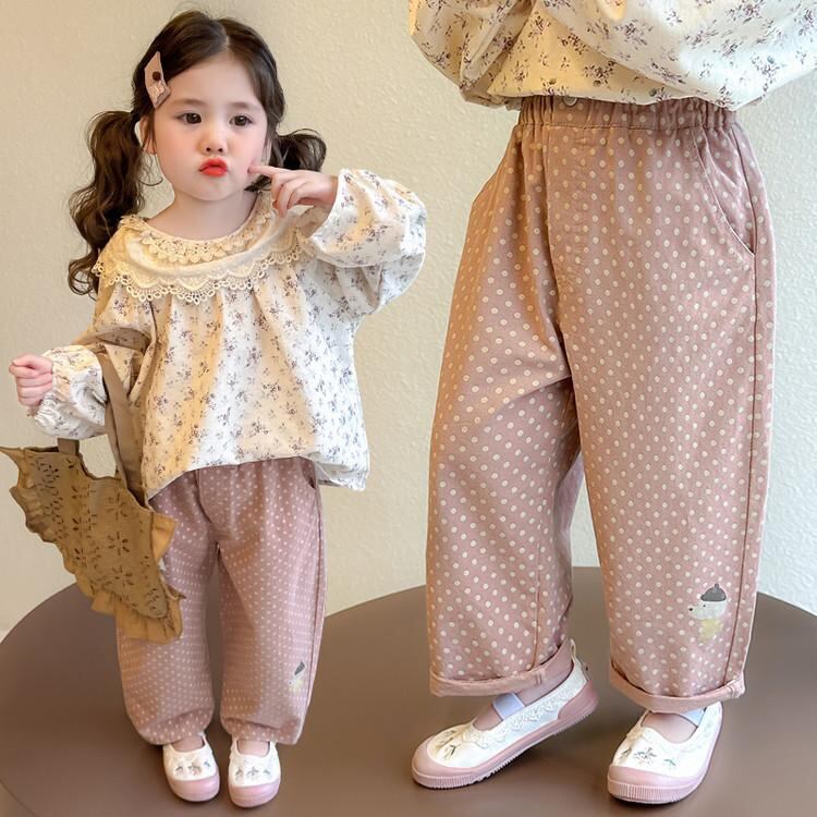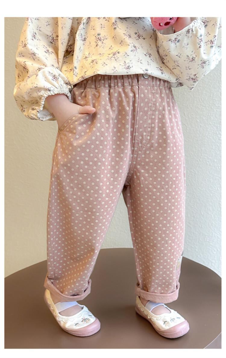 キッズ パンツ 春秋 かわいい 水玉模様 刺繡 デザイン ストレート ズボン 女の子 子供服 コットン ポリエステル混紡 普段着 ピンク 豆グリーン