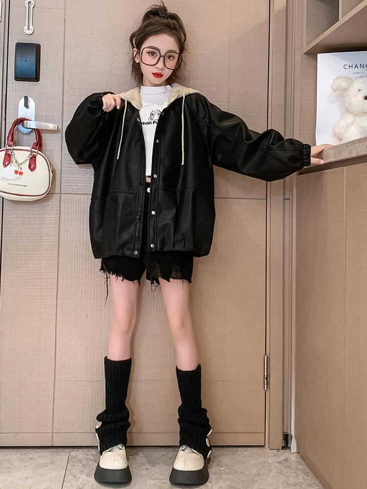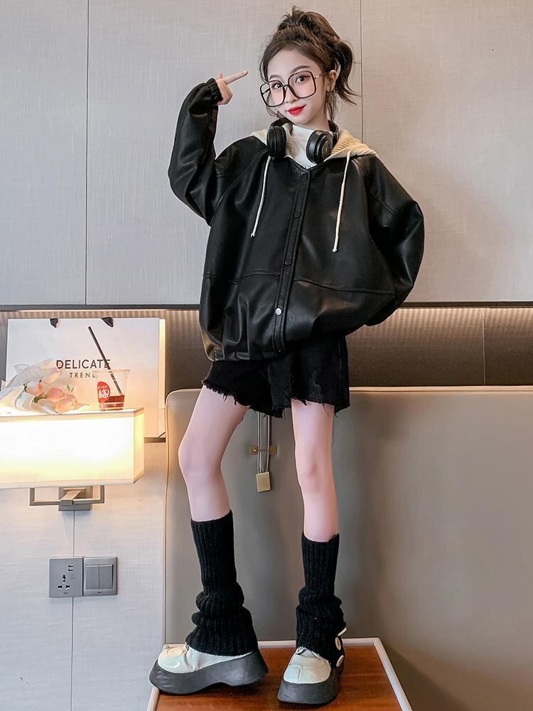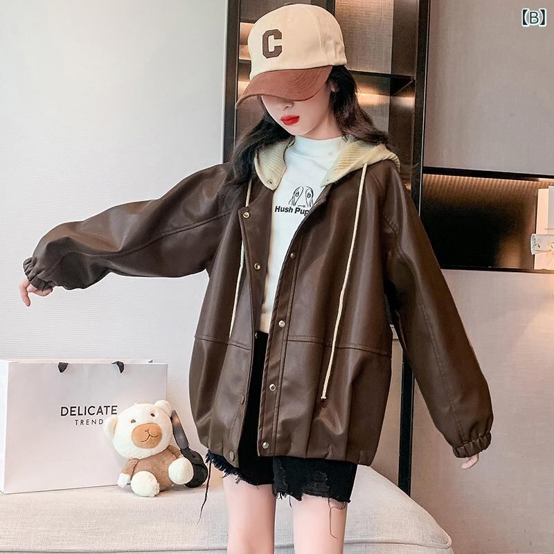 子供服 ジャケット 女の子 フード付き アウター PUレザー 中綿 ポリエステル 無地 韓国風 かわいい 普段使い お出かけ ブラック ブラウン系 秋冬