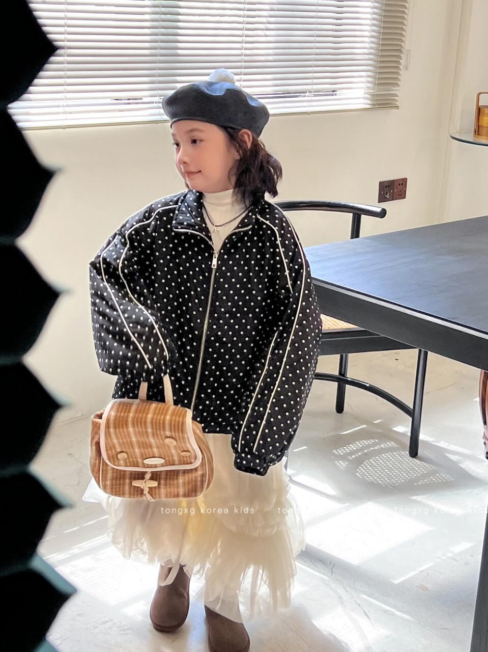 子供服 ジャケット 女の子 秋物 アウター 8歳以上向け 中綿入り 襟付き 韓国風 ブラック ドット柄 110cm 120cm 130cm 140cm 150cm 160cm 170cm