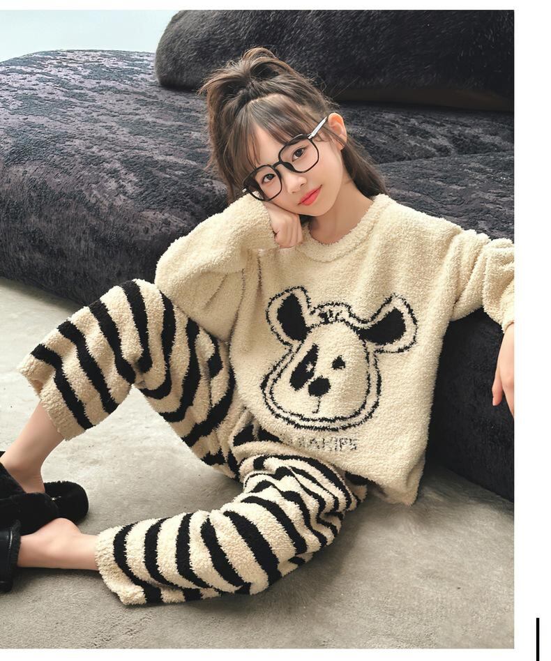 子供用ルームウェア 女の子 秋冬 厚手 フランネル 羊毛 杏色 韓国風 保温 暖か パジャマ 上下セット 120 130 140 150 160 170