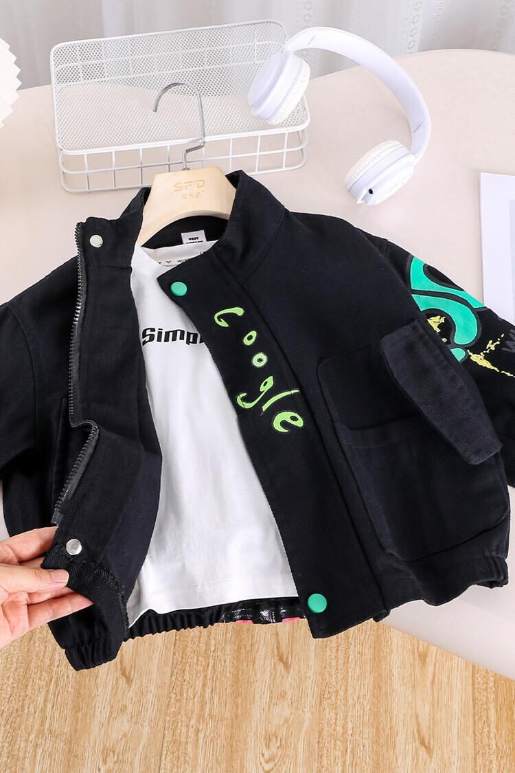 キッズ 男の子 コットン ジャケット 春秋 アウター 子供服 カジュアル 立襟 長袖 ショート丈 ブラック 90 100 110 120 130 140 150