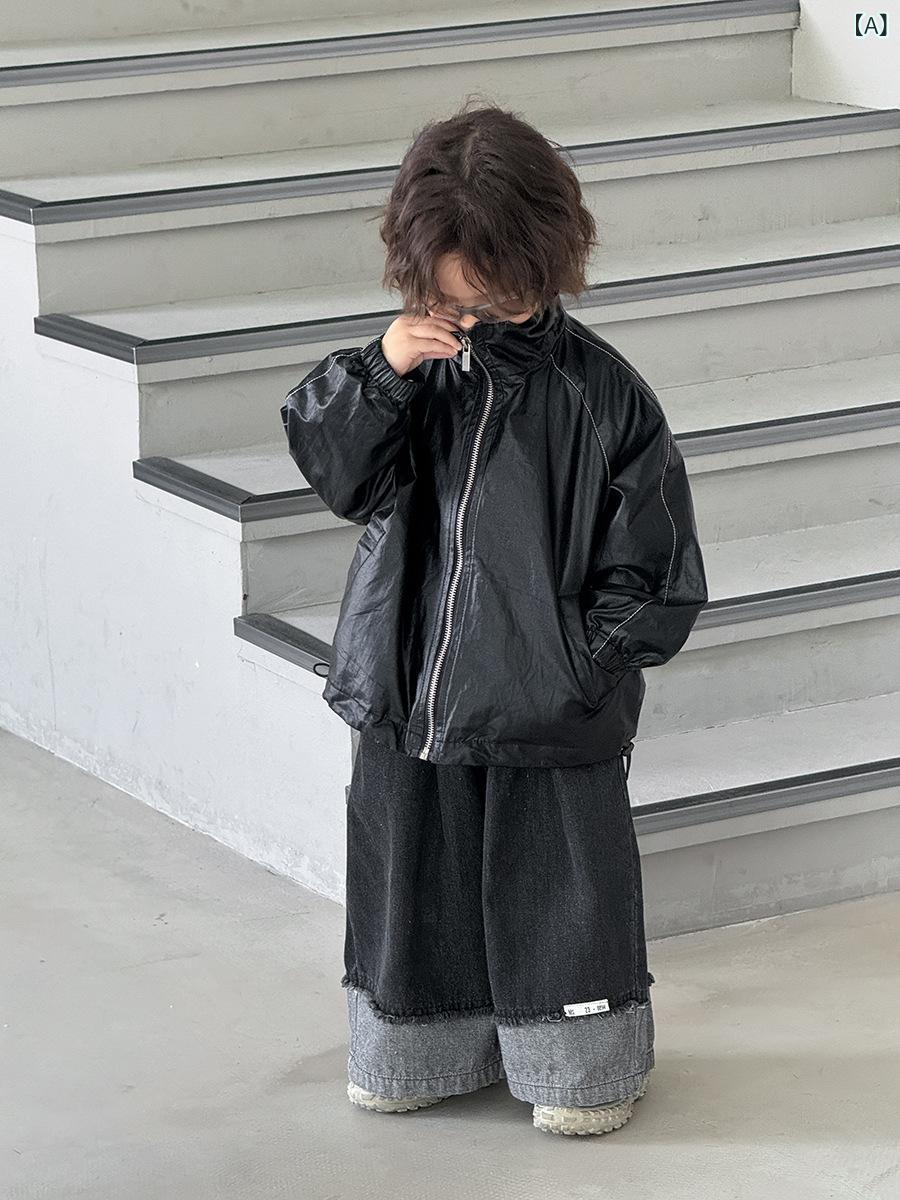 子供服 ジャケット 男の子 秋 アウター 8歳以上 韓国風 PUレザー 襟付き ブラック 長袖 ショート丈