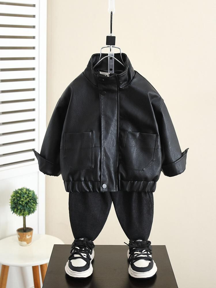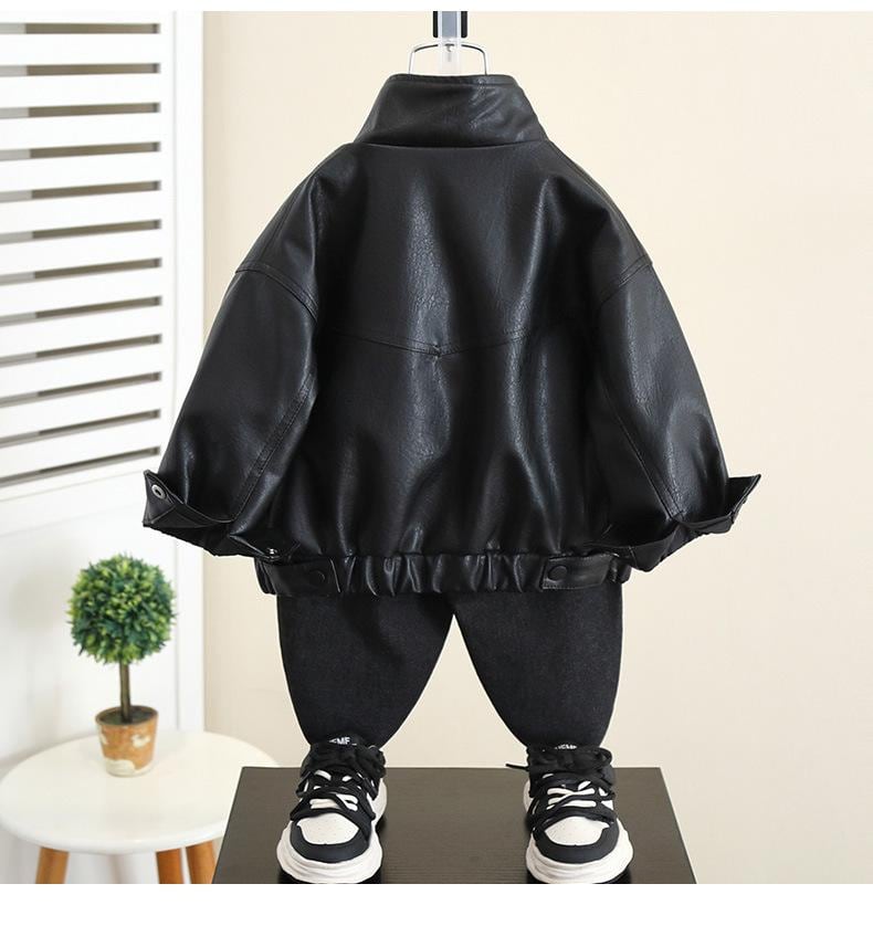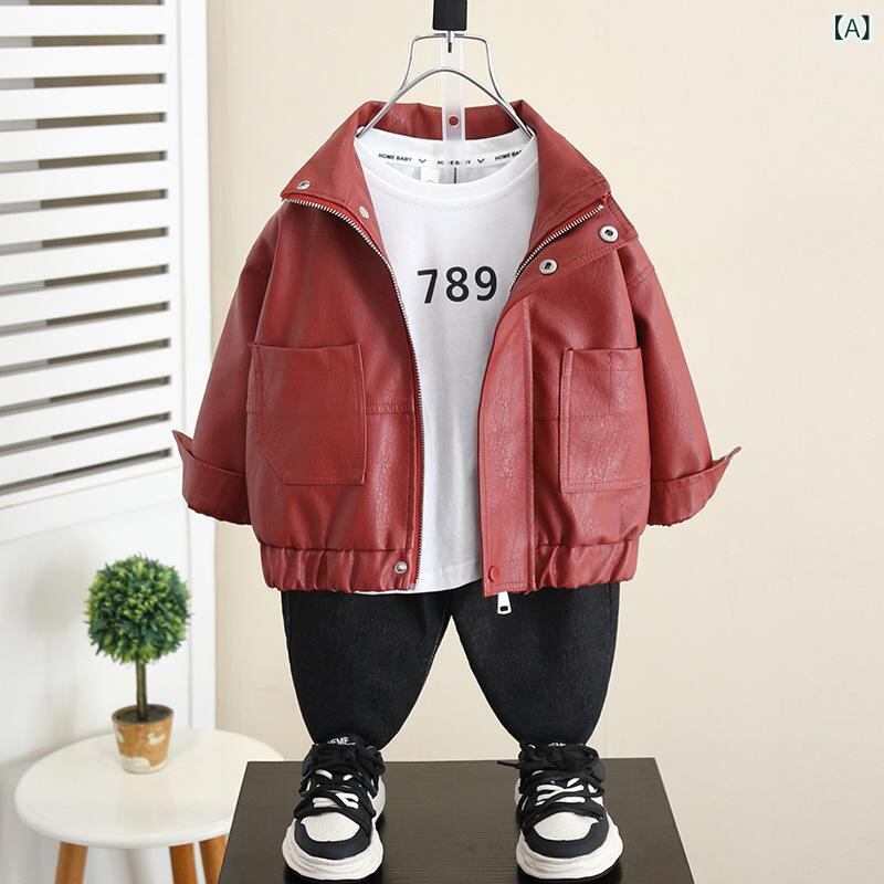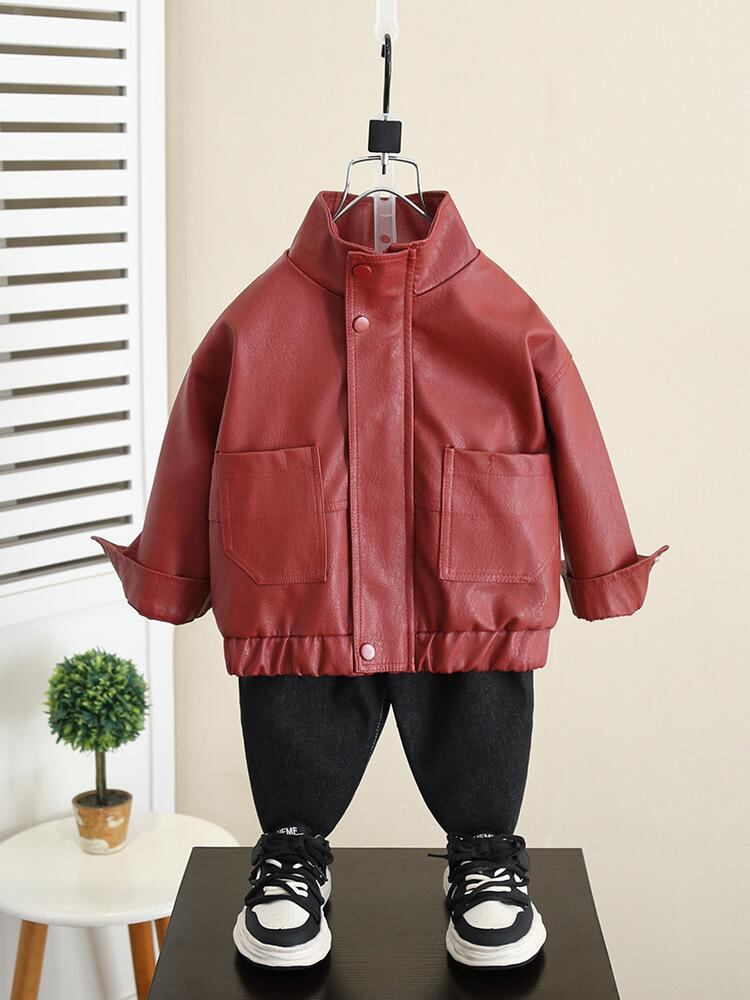 キッズ ジャケット 男の子 春秋 PUレザー アウター 子供服 ボーイズ ブルゾン ジャンパー スタンドカラー 長袖 ショート丈 普段着 おしゃれ スポーティー カジュアル 赤 黒