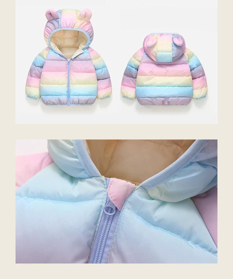 子供服 中綿入りジャケット 秋冬 男女兼用 ベビー キッズ アウター フード付き 上着 柔らかい 暖かい かわいい カジュアル レインボーカラー カラフル 恐竜柄 ポリエステル
