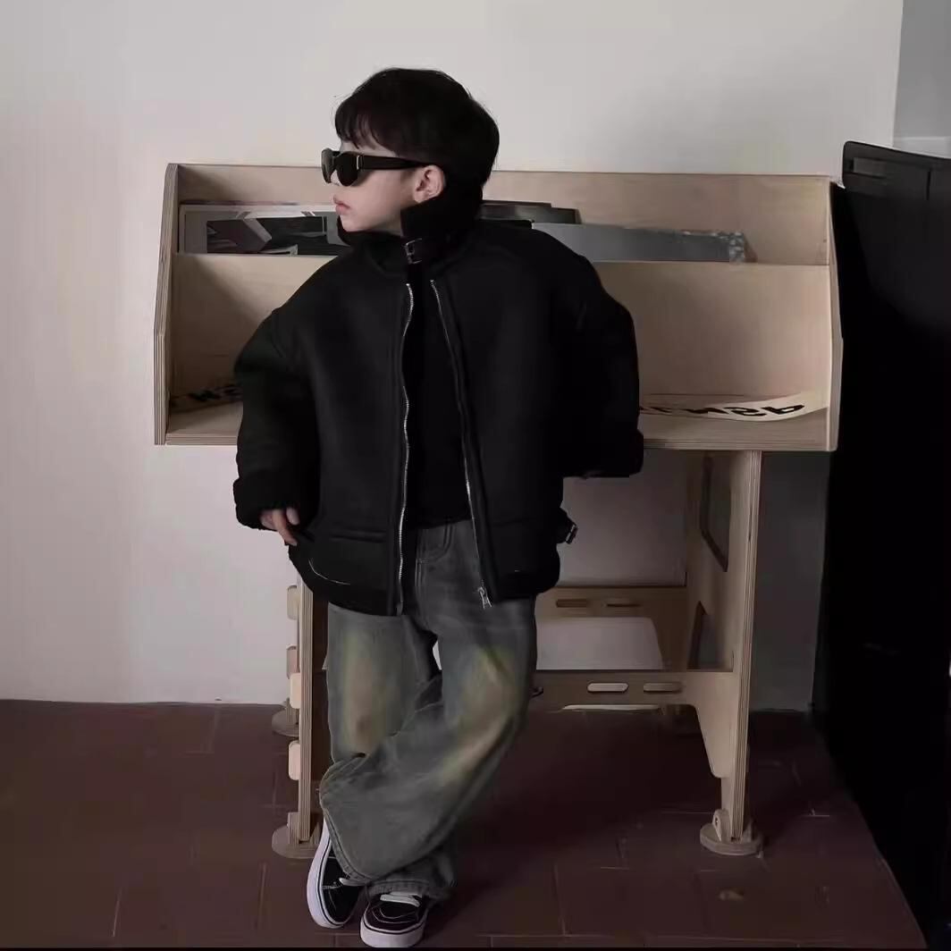 子供服 ジャケット 男女兼用 韓国風 スエード シープボア 裏起毛 厚手 防寒 アウター 立襟 ライダースジャケット