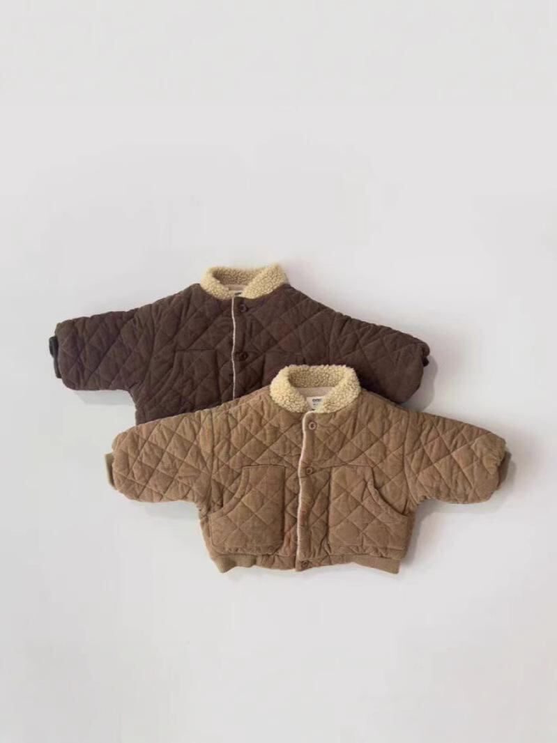 ベビー・キッズ服 男女兼用 レトロ調 ひし形 キルティング 厚手 防寒 コットン ジャケット アウター 春秋 冬 73 80 90 100cm コーデュロイ 綿