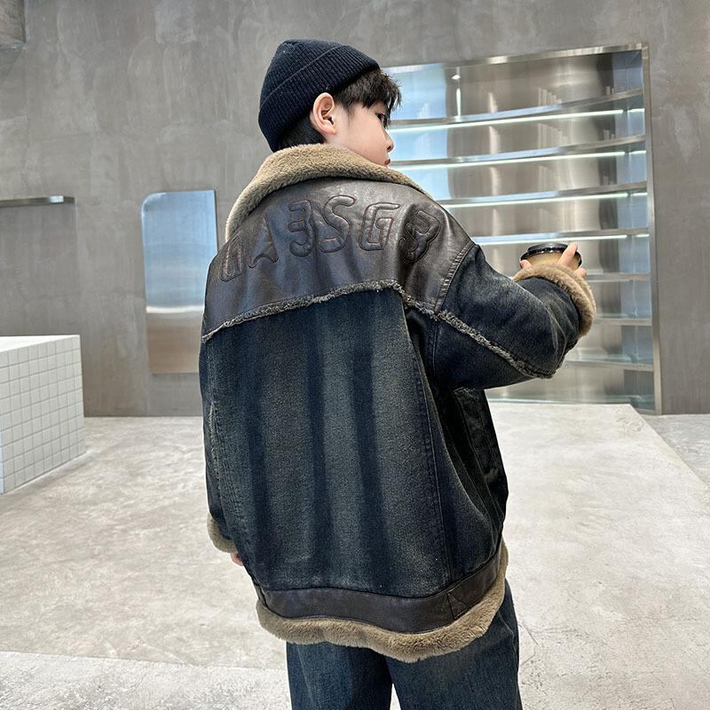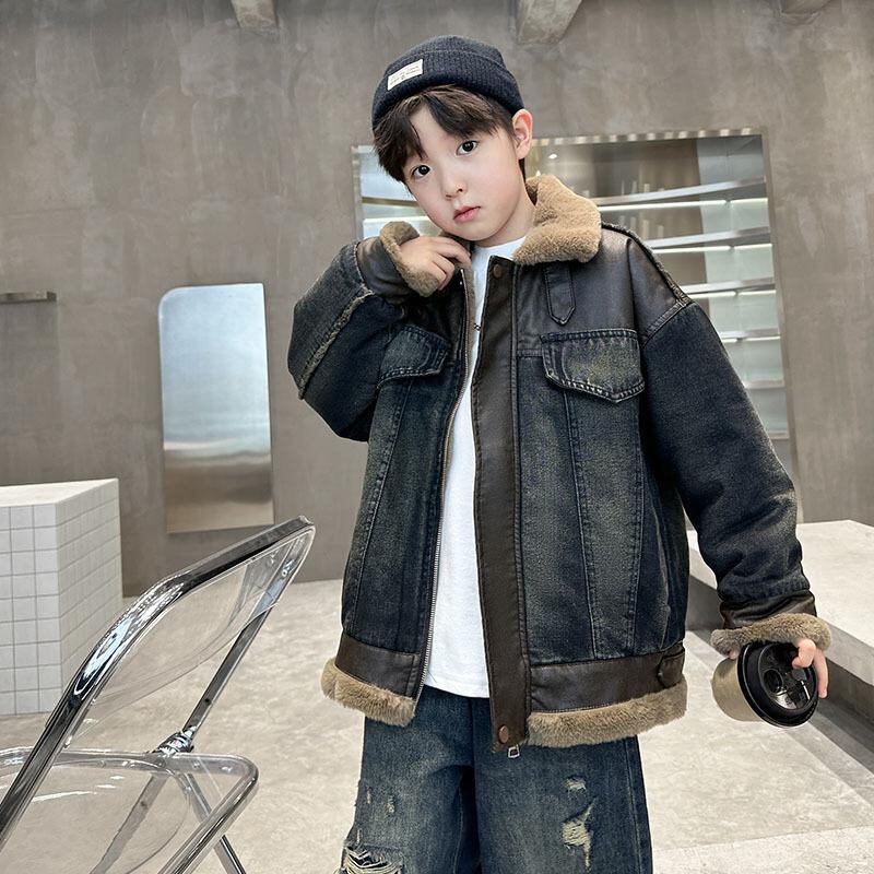 子供服 アウター ジャケット 男の子 裏起毛 デニム 秋冬 大童 子供 冬 厚手 普段着 長袖 中長丈 襟付き ジッパー ポリエステル