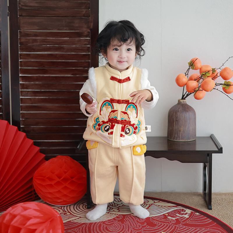 子供用ベスト 冬用 裏起毛 ベビーベスト 中国風 獅子柄 男の子 女の子 子供用 冬用 年越し 服