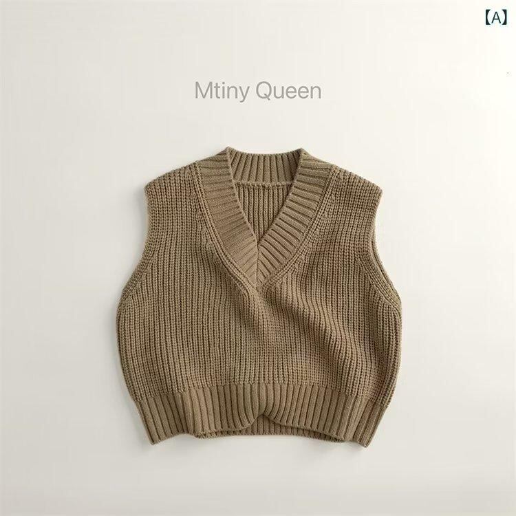 子供服 ニットベスト Vネック レトロ 韓国風 男女兼用 トップス チョッキ かわいい 柔らかい 暖かい カフェ色 黒色 春秋冬