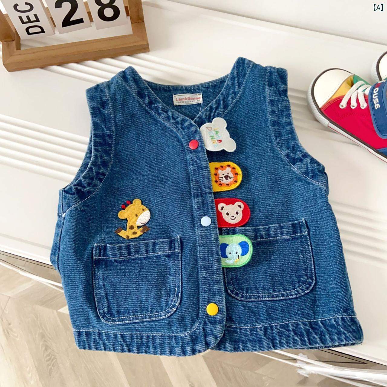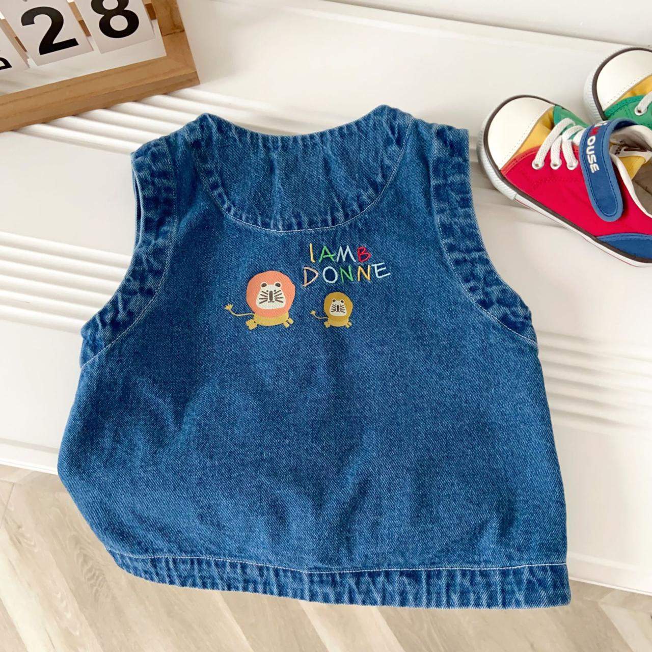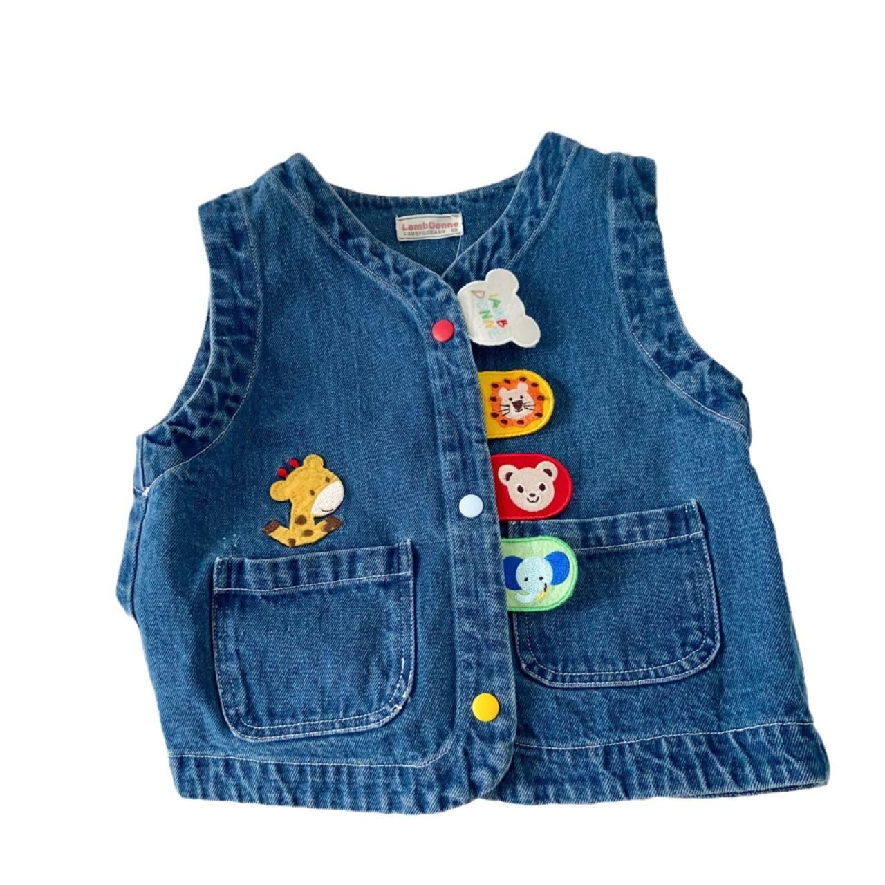 子供服 ベスト 春秋 デニム 男の子 女の子 ベビー キッズ ジレ 前開き かわいい アニマル柄 裏地付き コットン