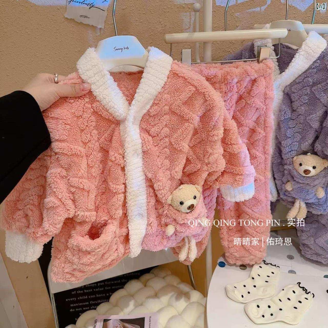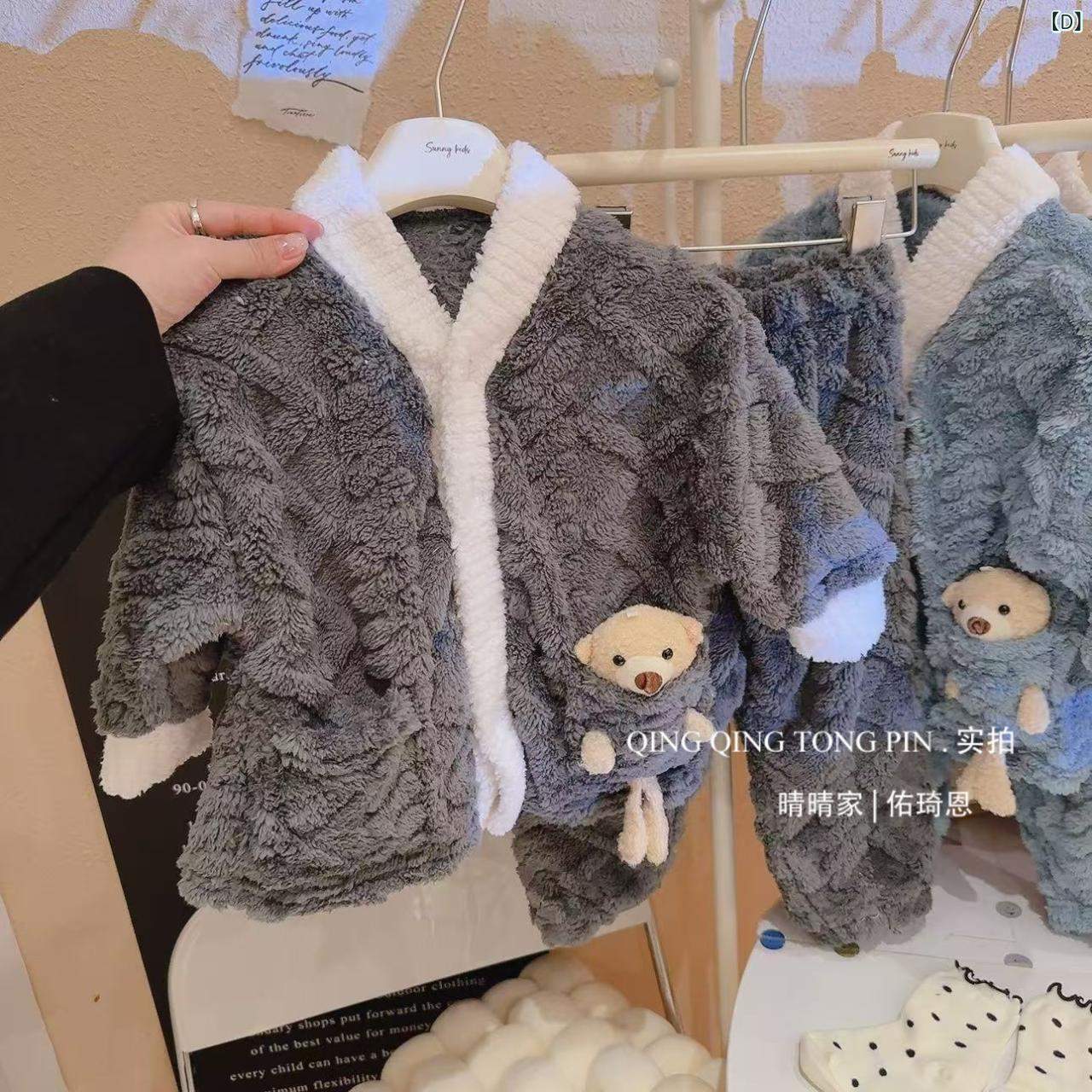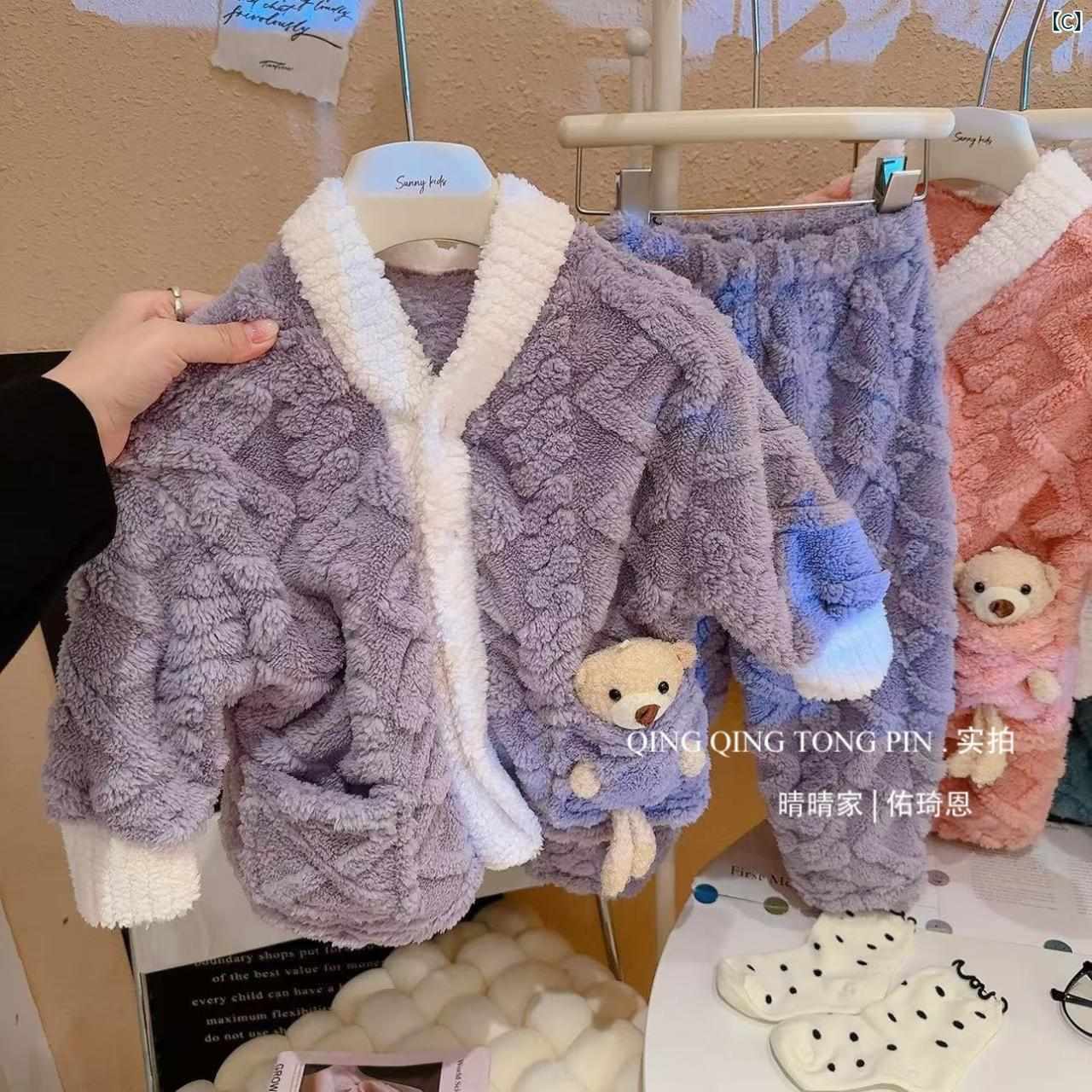 子供用パジャマ 上下セット 秋冬 厚手 フランネル 珊瑚フリース 暖か 中大キッズ ベビー 男女兼用 ルームウェア 小熊 かわいい ピンク ブルー パープル グレー