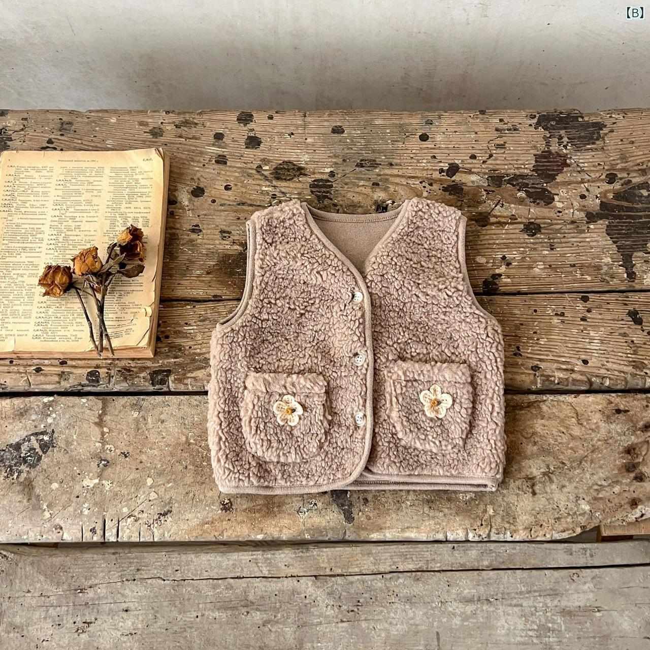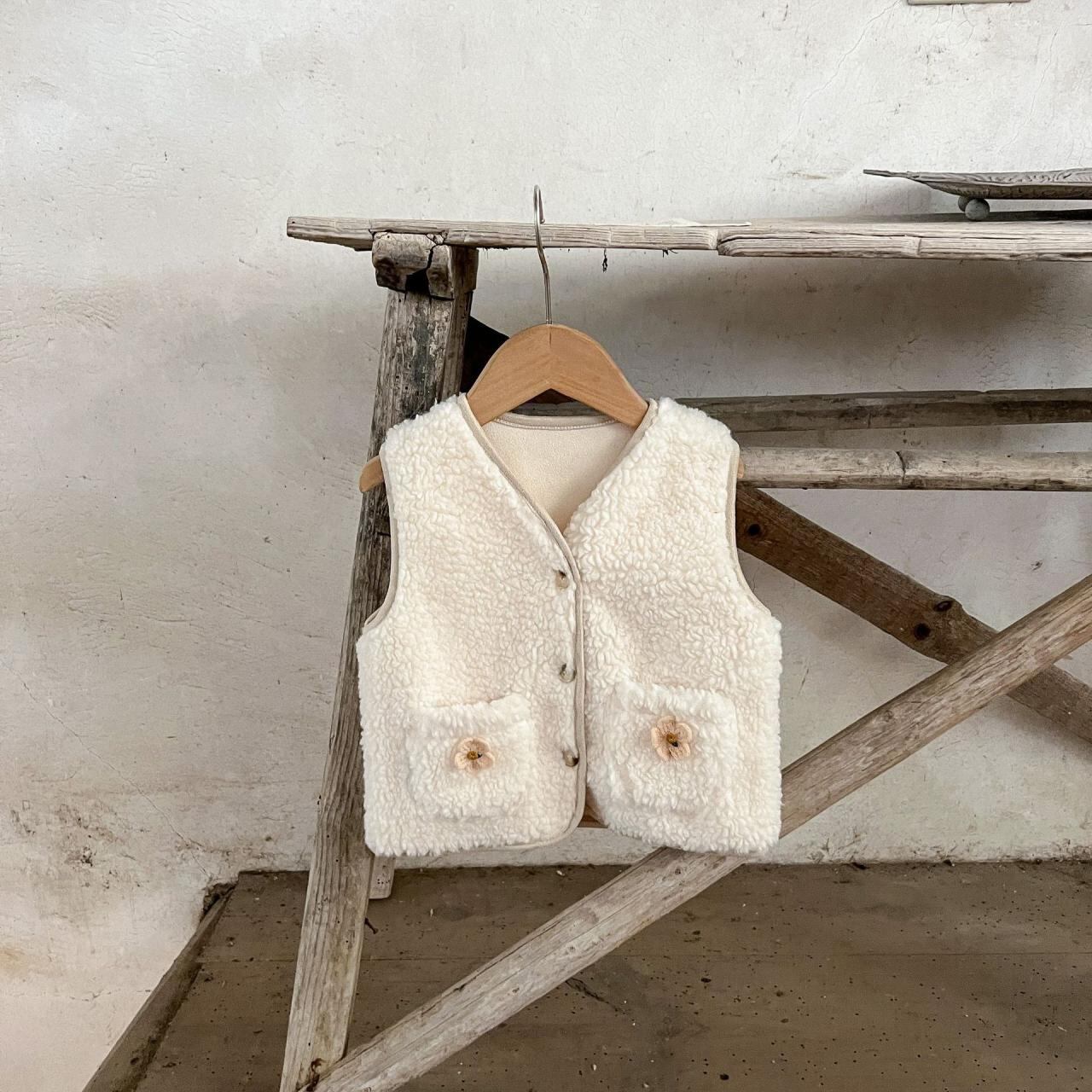 ベビー・キッズ 女の子 花柄 ボアベスト 防寒着 あったか アウター かわいい ふわふわ 柔らかい 裏地ポリエステル ベージュ コーヒー色 66cm 73cm 80cm 90cm 100cm