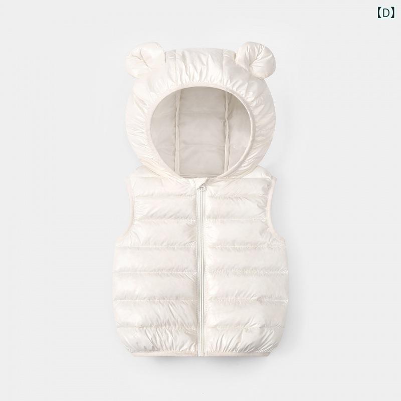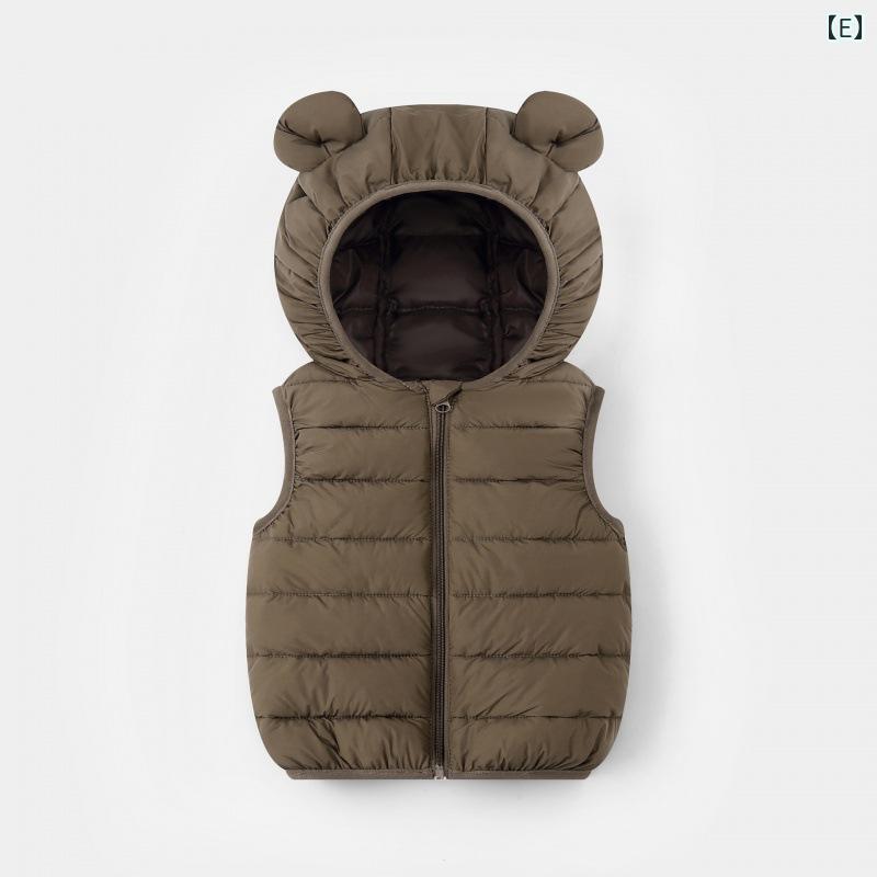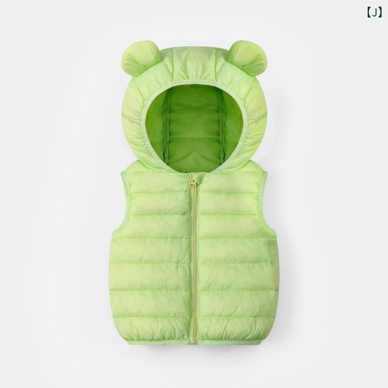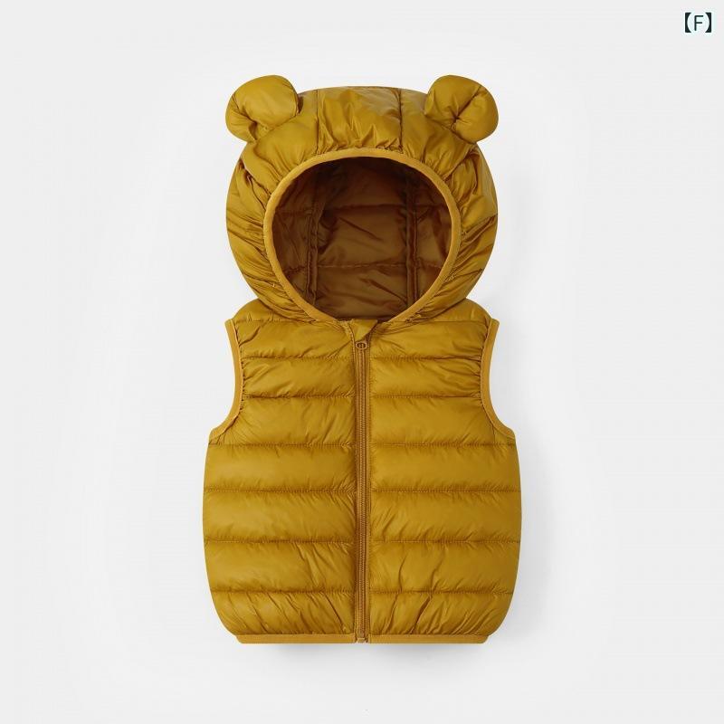子供用ベスト 春秋用 男女兼用 ベビー服 キャンディカラー かわいい 軽量 薄手 フード付き チョッキ あったか ポリエステル 無地 ブラック レッド ブルー アイボリー コーヒー色 イエロー グレー パープル ピンク系 グリーン